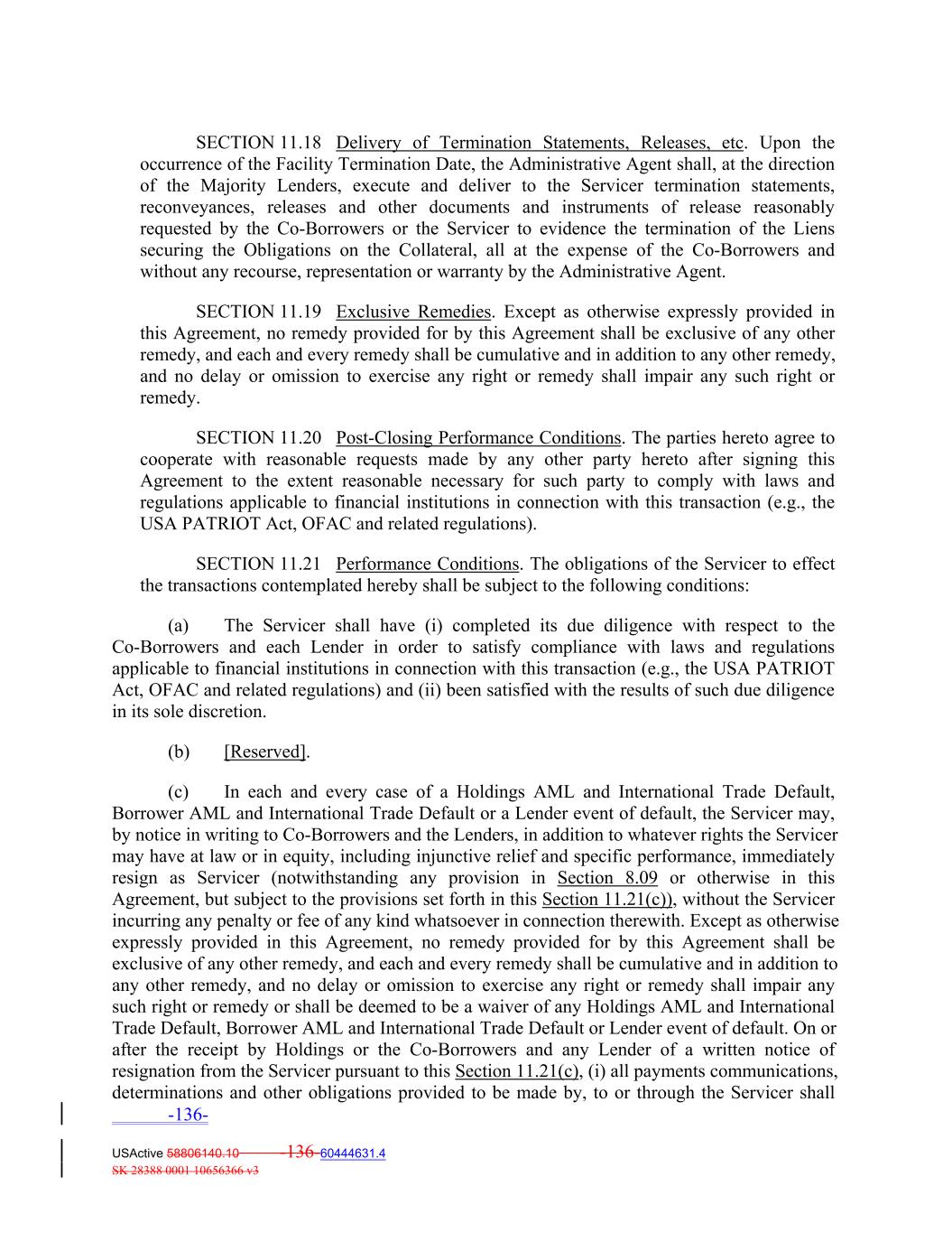 SECTION 11.18 Delivery of Termination Statements, Releases, etc. Upon the occurrence of the Facility Termination Date, the Administrative Agent shall, at the direction of the Majority Lenders, execute and deliver to the Servicer termination statements, reconveyances, releases and other documents and instruments of release reasonably requested by the Co‐Borrowers or the Servicer to evidence the termination of the Liens securing the Obligations on the Collateral, all at the expense of the Co‐Borrowers and without any recourse, representation or warranty by the Administrative Agent. SECTION 11.19 Exclusive Remedies. Except as otherwise expressly provided in this Agreement, no remedy provided for by this Agreement shall be exclusive of any other remedy, and each and every remedy shall be cumulative and in addition to any other remedy, and no delay or omission to exercise any right or remedy shall impair any such right or remedy. SECTION 11.20 Post‐Closing Performance Conditions. The parties hereto agree to cooperate with reasonable requests made by any other party hereto after signing this Agreement to the extent reasonable necessary for such party to comply with laws and regulations applicable to financial institutions in connection with this transaction (e.g., the USA PATRIOT Act, OFAC and related regulations). SECTION 11.21 Performance Conditions. The obligations of the Servicer to effect the transactions contemplated hereby shall be subject to the following conditions: (a) The Servicer shall have (i) completed its due diligence with respect to the Co‐Borrowers and each Lender in order to satisfy compliance with laws and regulations applicable to financial institutions in connection with this transaction (e.g., the USA PATRIOT Act, OFAC and related regulations) and (ii) been satisfied with the results of such due diligence in its sole discretion. (b) [Reserved]. (c) In each and every case of a Holdings AML and International Trade Default, Borrower AML and International Trade Default or a Lender event of default, the Servicer may, by notice in writing to Co‐Borrowers and the Lenders, in addition to whatever rights the Servicer may have at law or in equity, including injunctive relief and specific performance, immediately resign as Servicer (notwithstanding any provision in Section 8.09 or otherwise in this Agreement, but subject to the provisions set forth in this Section 11.21(c)), without the Servicer incurring any penalty or fee of any kind whatsoever in connection therewith. Except as otherwise expressly provided in this Agreement, no remedy provided for by this Agreement shall be exclusive of any other remedy, and each and every remedy shall be cumulative and in addition to any other remedy, and no delay or omission to exercise any right or remedy shall impair any such right or remedy or shall be deemed to be a waiver of any Holdings AML and International Trade Default, Borrower AML and International Trade Default or Lender event of default. On or after the receipt by Holdings or the Co‐Borrowers and any Lender of a written notice of resignation from the Servicer pursuant to this Section 11.21(c), (i) all payments communications, determinations and other obligations provided to be made by, to or through the Servicer shall -136- USActive 58806140.10 -136-60444631.4 SK 28388 0001 10656366 v3