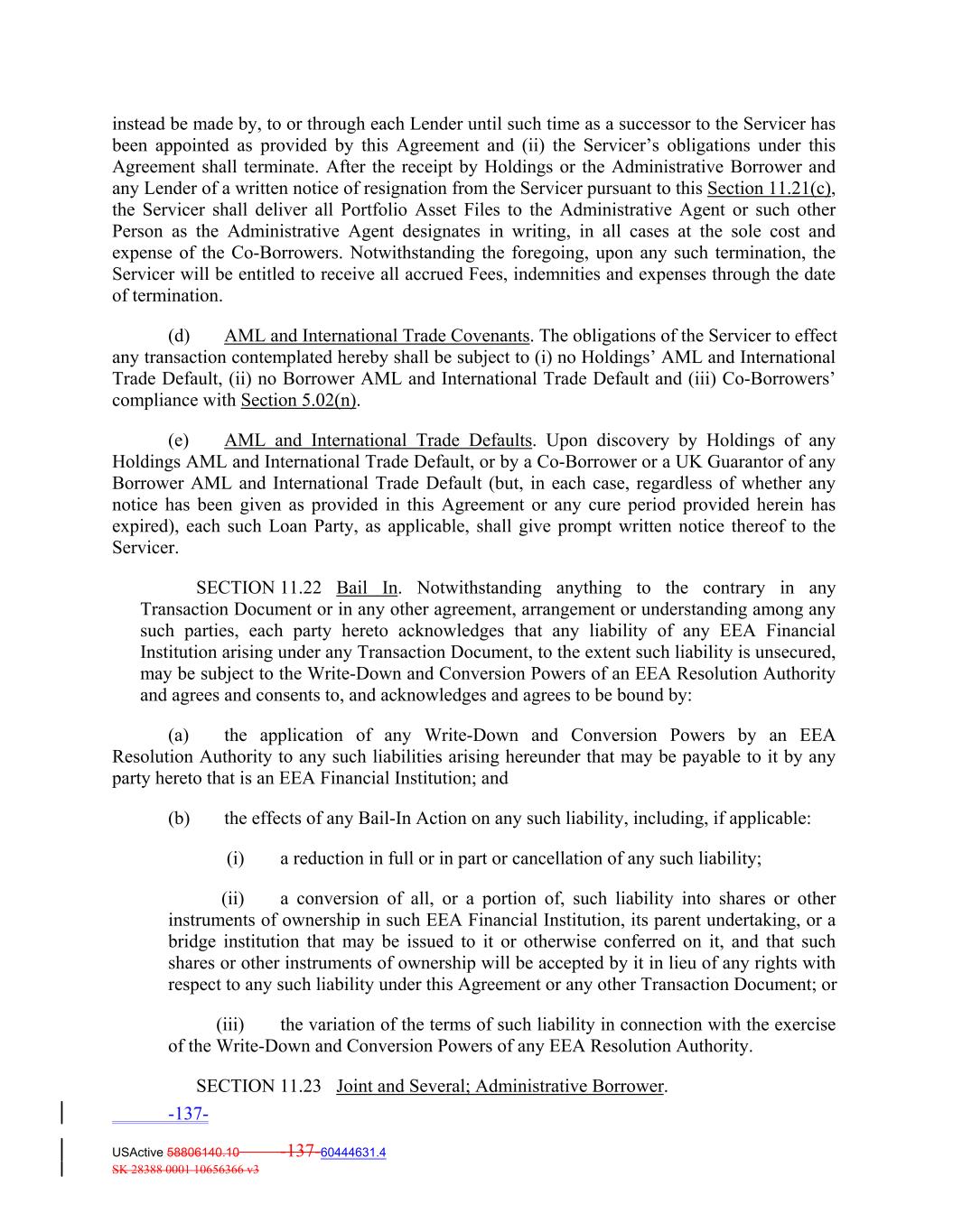 instead be made by, to or through each Lender until such time as a successor to the Servicer has been appointed as provided by this Agreement and (ii) the Servicer’s obligations under this Agreement shall terminate. After the receipt by Holdings or the Administrative Borrower and any Lender of a written notice of resignation from the Servicer pursuant to this Section 11.21(c), the Servicer shall deliver all Portfolio Asset Files to the Administrative Agent or such other Person as the Administrative Agent designates in writing, in all cases at the sole cost and expense of the Co‐Borrowers. Notwithstanding the foregoing, upon any such termination, the Servicer will be entitled to receive all accrued Fees, indemnities and expenses through the date of termination. (d) AML and International Trade Covenants. The obligations of the Servicer to effect any transaction contemplated hereby shall be subject to (i) no Holdings’ AML and International Trade Default, (ii) no Borrower AML and International Trade Default and (iii) Co‐Borrowers’ compliance with Section 5.02(n). (e) AML and International Trade Defaults. Upon discovery by Holdings of any Holdings AML and International Trade Default, or by a Co‐Borrower or a UK Guarantor of any Borrower AML and International Trade Default (but, in each case, regardless of whether any notice has been given as provided in this Agreement or any cure period provided herein has expired), each such Loan Party, as applicable, shall give prompt written notice thereof to the Servicer. SECTION 11.22 Bail In. Notwithstanding anything to the contrary in any Transaction Document or in any other agreement, arrangement or understanding among any such parties, each party hereto acknowledges that any liability of any EEA Financial Institution arising under any Transaction Document, to the extent such liability is unsecured, may be subject to the Write‐Down and Conversion Powers of an EEA Resolution Authority and agrees and consents to, and acknowledges and agrees to be bound by: (a) the application of any Write‐Down and Conversion Powers by an EEA Resolution Authority to any such liabilities arising hereunder that may be payable to it by any party hereto that is an EEA Financial Institution; and (b) the effects of any Bail‐In Action on any such liability, including, if applicable: (i) a reduction in full or in part or cancellation of any such liability; (ii) a conversion of all, or a portion of, such liability into shares or other instruments of ownership in such EEA Financial Institution, its parent undertaking, or a bridge institution that may be issued to it or otherwise conferred on it, and that such shares or other instruments of ownership will be accepted by it in lieu of any rights with respect to any such liability under this Agreement or any other Transaction Document; or (iii) the variation of the terms of such liability in connection with the exercise of the Write‐Down and Conversion Powers of any EEA Resolution Authority. SECTION 11.23 Joint and Several; Administrative Borrower. -137- USActive 58806140.10 -137-60444631.4 SK 28388 0001 10656366 v3