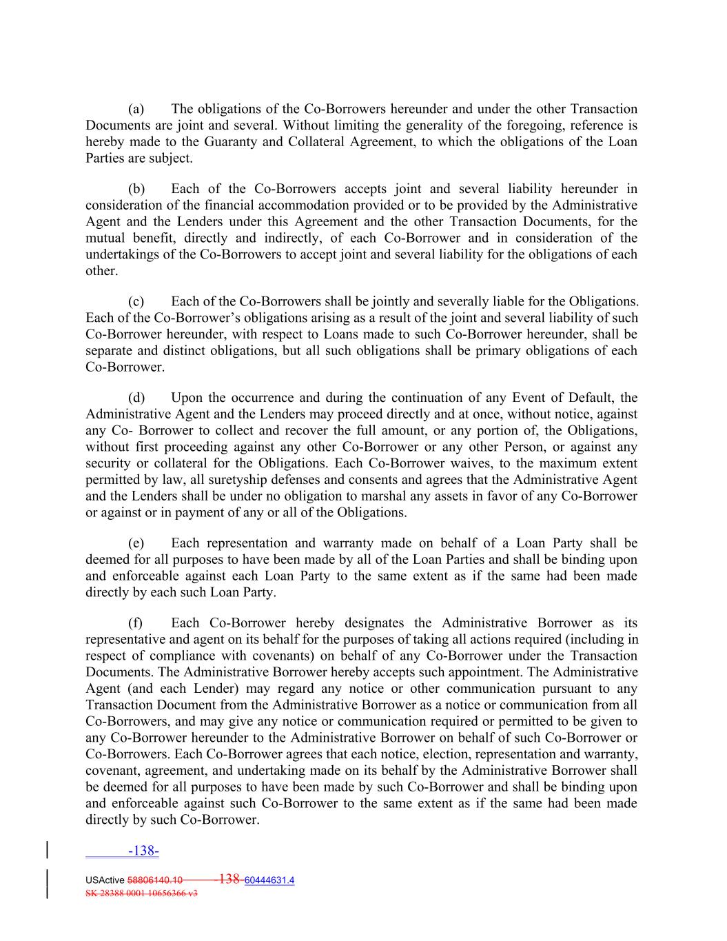 (a) The obligations of the Co‐Borrowers hereunder and under the other Transaction Documents are joint and several. Without limiting the generality of the foregoing, reference is hereby made to the Guaranty and Collateral Agreement, to which the obligations of the Loan Parties are subject. (b) Each of the Co‐Borrowers accepts joint and several liability hereunder in consideration of the financial accommodation provided or to be provided by the Administrative Agent and the Lenders under this Agreement and the other Transaction Documents, for the mutual benefit, directly and indirectly, of each Co‐Borrower and in consideration of the undertakings of the Co‐Borrowers to accept joint and several liability for the obligations of each other. (c) Each of the Co‐Borrowers shall be jointly and severally liable for the Obligations. Each of the Co‐Borrower’s obligations arising as a result of the joint and several liability of such Co‐Borrower hereunder, with respect to Loans made to such Co‐Borrower hereunder, shall be separate and distinct obligations, but all such obligations shall be primary obligations of each Co‐Borrower. (d) Upon the occurrence and during the continuation of any Event of Default, the Administrative Agent and the Lenders may proceed directly and at once, without notice, against any Co‐ Borrower to collect and recover the full amount, or any portion of, the Obligations, without first proceeding against any other Co‐Borrower or any other Person, or against any security or collateral for the Obligations. Each Co‐Borrower waives, to the maximum extent permitted by law, all suretyship defenses and consents and agrees that the Administrative Agent and the Lenders shall be under no obligation to marshal any assets in favor of any Co‐Borrower or against or in payment of any or all of the Obligations. (e) Each representation and warranty made on behalf of a Loan Party shall be deemed for all purposes to have been made by all of the Loan Parties and shall be binding upon and enforceable against each Loan Party to the same extent as if the same had been made directly by each such Loan Party. (f) Each Co‐Borrower hereby designates the Administrative Borrower as its representative and agent on its behalf for the purposes of taking all actions required (including in respect of compliance with covenants) on behalf of any Co‐Borrower under the Transaction Documents. The Administrative Borrower hereby accepts such appointment. The Administrative Agent (and each Lender) may regard any notice or other communication pursuant to any Transaction Document from the Administrative Borrower as a notice or communication from all Co‐Borrowers, and may give any notice or communication required or permitted to be given to any Co‐Borrower hereunder to the Administrative Borrower on behalf of such Co‐Borrower or Co‐Borrowers. Each Co‐Borrower agrees that each notice, election, representation and warranty, covenant, agreement, and undertaking made on its behalf by the Administrative Borrower shall be deemed for all purposes to have been made by such Co‐Borrower and shall be binding upon and enforceable against such Co‐Borrower to the same extent as if the same had been made directly by such Co‐Borrower. -138- USActive 58806140.10 -138-60444631.4 SK 28388 0001 10656366 v3