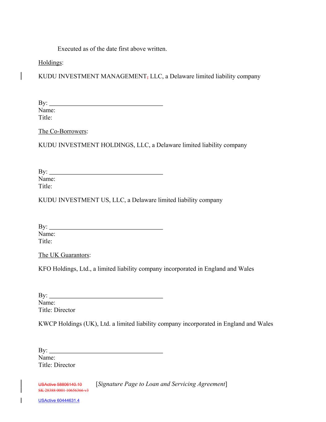 Executed as of the date first above written. Holdings: KUDU INVESTMENT MANAGEMENT, LLC, a Delaware limited liability company By: Name: Title: The Co‐Borrowers: KUDU INVESTMENT HOLDINGS, LLC, a Delaware limited liability company By: Name: Title: KUDU INVESTMENT US, LLC, a Delaware limited liability company By: Name: Title: The UK Guarantors: KFO Holdings, Ltd., a limited liability company incorporated in England and Wales By: Name: Title: Director KWCP Holdings (UK), Ltd. a limited liability company incorporated in England and Wales By: Name: Title: Director USActive 58806140.10 [Signature Page to Loan and Servicing Agreement] SK 28388 0001 10656366 v3 USActive 60444631.4