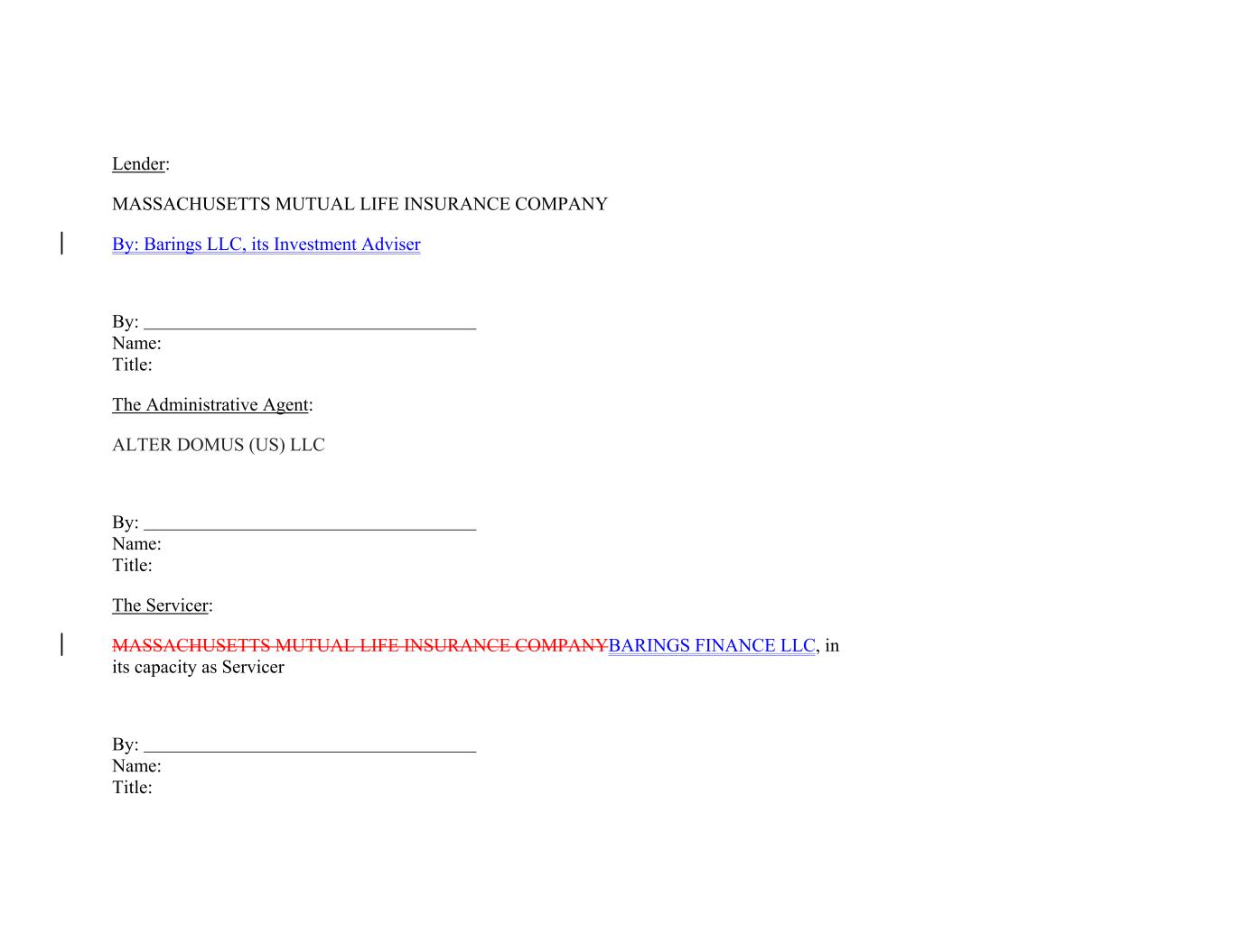 Lender: MASSACHUSETTS MUTUAL LIFE INSURANCE COMPANY By: Barings LLC, its Investment Adviser By: Name: Title: The Administrative Agent: ALTER DOMUS (US) LLC By: Name: Title: The Servicer: MASSACHUSETTS MUTUAL LIFE INSURANCE COMPANYBARINGS FINANCE LLC, in its capacity as Servicer By: Name: Title: