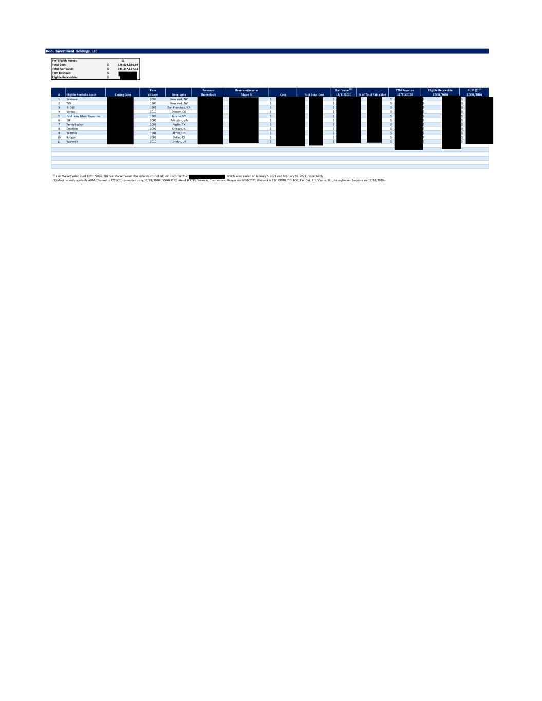 Kudu Investment Holdings, LLC # of Eligible Assets: 11 Total Cost: 328,829,185.59$ Total Fair Value: 345,347,117.53$ TTM Revenue: $ Eligible Receivable: $ # Eligible Portfolio Asset Closing Date Firm Vintage Geography Revenue Share Basis Revenue/Income Share % Cost % of Total Cost Fair Value (1) 12/31/2020 % of Total Fair Value TTM Revenue 12/31/2020 Eligible Receivable 12/31/2020 AUM ($) (2) 12/31/2020 1 Savanna 2006 New York, NY $ $ $ $ $ 2 TIG 1980 New York, NY $ $ $ $ $ 3 B|O|S 1985 San Francisco, CA $ $ $ $ $ 4 Versus 2010 Denver, CO $ $ $ $ $ 5 First Long Island Investors 1983 Jericho, NY $ $ $ $ $ 6 EJF 2005 Arlington, VA $ $ $ $ $ 7 Pennybacker 2006 Austin, TX $ $ $ $ $ 8 Creation 2007 Chicago, IL $ $ $ $ $ 9 Sequoia 1991 Akron, OH $ $ $ $ $ 10 Ranger 2003 Dallas, TX $ $ $ $ $ 11 Warwick 2010 London, UK $ $ $ $ $ (1) Fair Market Value as of 12/31/2020. TIG Fair Market Value also includes cost of add-on investments of , which were closed on January 5, 2021 and February 16, 2021, respectively. (2) Most recently available AUM (Channel is 7/31/20, converted using 12/31/2020 USD/AUD FX rate of 0.7715; Savanna, Creation and Ranger are 9/30/2020; Warwick is 12/1/2020; TIG, BOS, Fair Oak, EJF, Versus, FLII, Pennybacker, Sequoia are 12/31/2020).