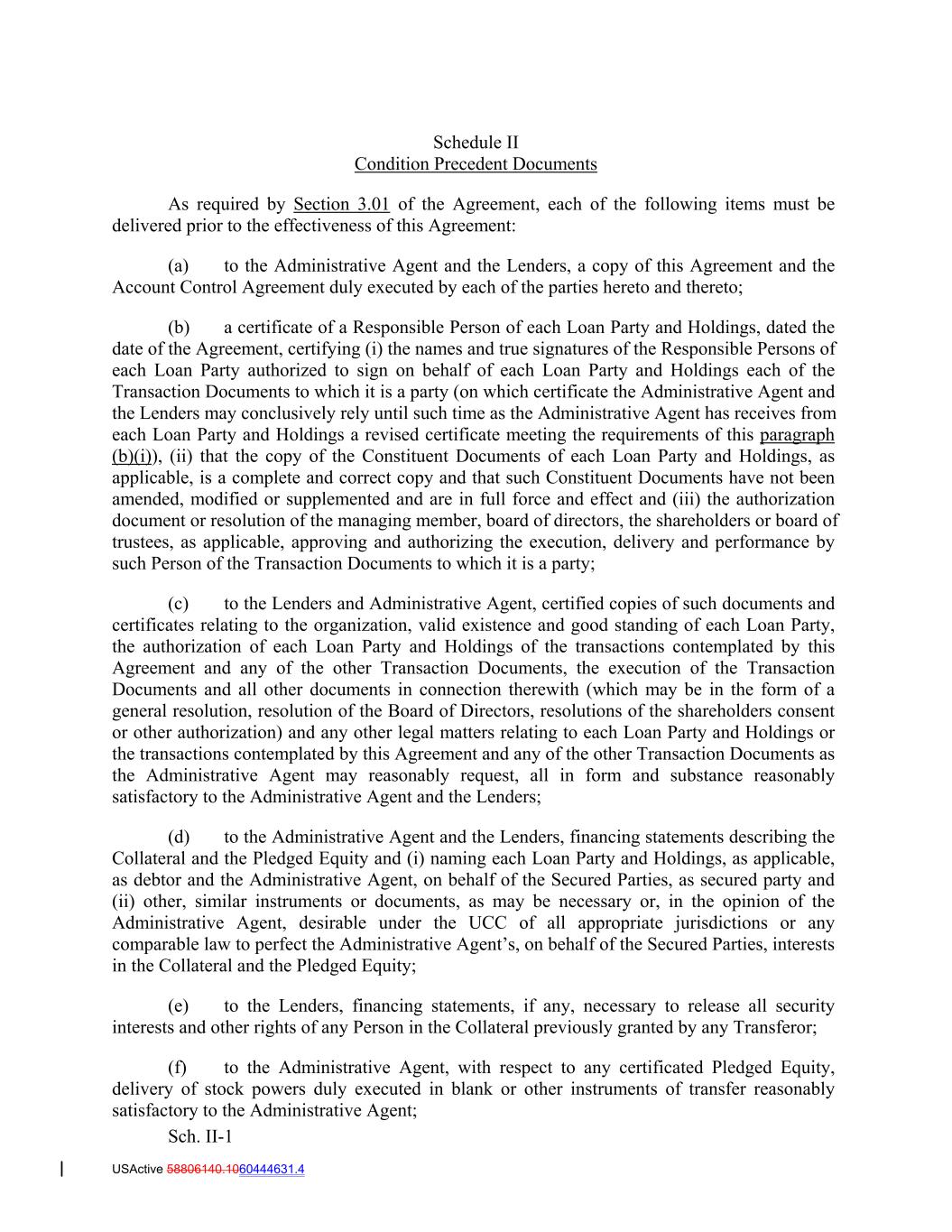 Schedule II Condition Precedent Documents As required by Section 3.01 of the Agreement, each of the following items must be delivered prior to the effectiveness of this Agreement: (a) to the Administrative Agent and the Lenders, a copy of this Agreement and the Account Control Agreement duly executed by each of the parties hereto and thereto; (b) a certificate of a Responsible Person of each Loan Party and Holdings, dated the date of the Agreement, certifying (i) the names and true signatures of the Responsible Persons of each Loan Party authorized to sign on behalf of each Loan Party and Holdings each of the Transaction Documents to which it is a party (on which certificate the Administrative Agent and the Lenders may conclusively rely until such time as the Administrative Agent has receives from each Loan Party and Holdings a revised certificate meeting the requirements of this paragraph (b)(i)), (ii) that the copy of the Constituent Documents of each Loan Party and Holdings, as applicable, is a complete and correct copy and that such Constituent Documents have not been amended, modified or supplemented and are in full force and effect and (iii) the authorization document or resolution of the managing member, board of directors, the shareholders or board of trustees, as applicable, approving and authorizing the execution, delivery and performance by such Person of the Transaction Documents to which it is a party; (c) to the Lenders and Administrative Agent, certified copies of such documents and certificates relating to the organization, valid existence and good standing of each Loan Party, the authorization of each Loan Party and Holdings of the transactions contemplated by this Agreement and any of the other Transaction Documents, the execution of the Transaction Documents and all other documents in connection therewith (which may be in the form of a general resolution, resolution of the Board of Directors, resolutions of the shareholders consent or other authorization) and any other legal matters relating to each Loan Party and Holdings or the transactions contemplated by this Agreement and any of the other Transaction Documents as the Administrative Agent may reasonably request, all in form and substance reasonably satisfactory to the Administrative Agent and the Lenders; (d) to the Administrative Agent and the Lenders, financing statements describing the Collateral and the Pledged Equity and (i) naming each Loan Party and Holdings, as applicable, as debtor and the Administrative Agent, on behalf of the Secured Parties, as secured party and (ii) other, similar instruments or documents, as may be necessary or, in the opinion of the Administrative Agent, desirable under the UCC of all appropriate jurisdictions or any comparable law to perfect the Administrative Agent’s, on behalf of the Secured Parties, interests in the Collateral and the Pledged Equity; (e) to the Lenders, financing statements, if any, necessary to release all security interests and other rights of any Person in the Collateral previously granted by any Transferor; (f) to the Administrative Agent, with respect to any certificated Pledged Equity, delivery of stock powers duly executed in blank or other instruments of transfer reasonably satisfactory to the Administrative Agent; Sch. II-1 USActive 58806140.1060444631.4