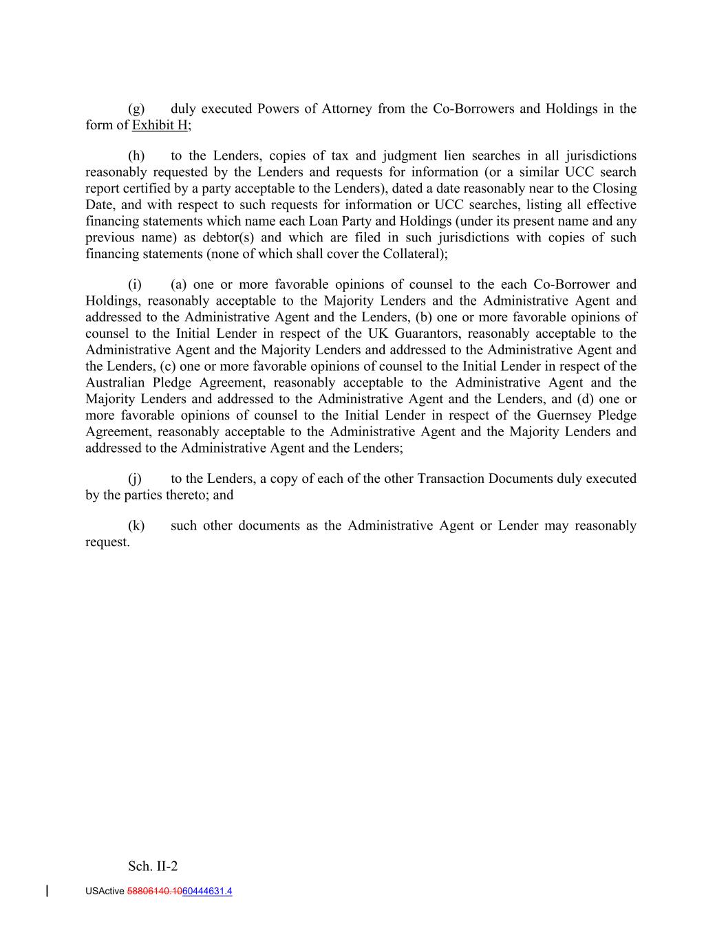 (g) duly executed Powers of Attorney from the Co‐Borrowers and Holdings in the form of Exhibit H; (h) to the Lenders, copies of tax and judgment lien searches in all jurisdictions reasonably requested by the Lenders and requests for information (or a similar UCC search report certified by a party acceptable to the Lenders), dated a date reasonably near to the Closing Date, and with respect to such requests for information or UCC searches, listing all effective financing statements which name each Loan Party and Holdings (under its present name and any previous name) as debtor(s) and which are filed in such jurisdictions with copies of such financing statements (none of which shall cover the Collateral); (i) (a) one or more favorable opinions of counsel to the each Co‐Borrower and Holdings, reasonably acceptable to the Majority Lenders and the Administrative Agent and addressed to the Administrative Agent and the Lenders, (b) one or more favorable opinions of counsel to the Initial Lender in respect of the UK Guarantors, reasonably acceptable to the Administrative Agent and the Majority Lenders and addressed to the Administrative Agent and the Lenders, (c) one or more favorable opinions of counsel to the Initial Lender in respect of the Australian Pledge Agreement, reasonably acceptable to the Administrative Agent and the Majority Lenders and addressed to the Administrative Agent and the Lenders, and (d) one or more favorable opinions of counsel to the Initial Lender in respect of the Guernsey Pledge Agreement, reasonably acceptable to the Administrative Agent and the Majority Lenders and addressed to the Administrative Agent and the Lenders; (j) to the Lenders, a copy of each of the other Transaction Documents duly executed by the parties thereto; and (k) such other documents as the Administrative Agent or Lender may reasonably request. Sch. II-2 USActive 58806140.1060444631.4