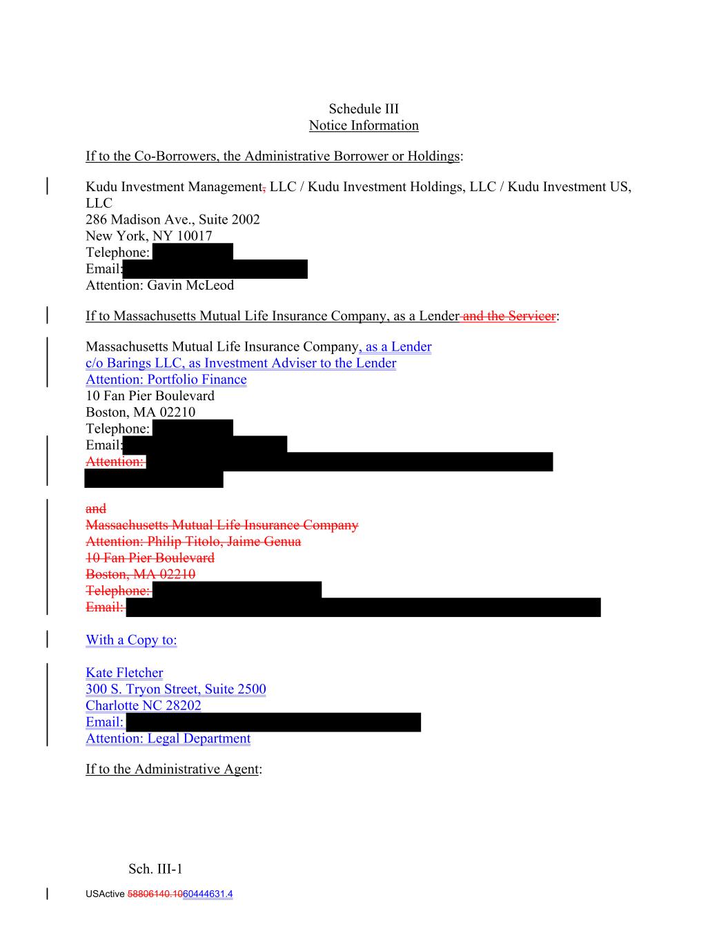 Schedule III Notice Information If to the Co‐Borrowers, the Administrative Borrower or Holdings: Kudu Investment Management, LLC / Kudu Investment Holdings, LLC / Kudu Investment US, LLC 286 Madison Ave., Suite 2002 New York, NY 10017 Telephone: Email: Attention: Gavin McLeod If to Massachusetts Mutual Life Insurance Company, as a Lender and the Servicer: Massachusetts Mutual Life Insurance Company, as a Lender c/o Barings LLC, as Investment Adviser to the Lender Attention: Portfolio Finance 10 Fan Pier Boulevard Boston, MA 02210 Telephone: Email: Attention: and Massachusetts Mutual Life Insurance Company Attention: Philip Titolo, Jaime Genua 10 Fan Pier Boulevard Boston, MA 02210 Telephone: Email: With a Copy to: Kate Fletcher 300 S. Tryon Street, Suite 2500 Charlotte NC 28202 Email: Attention: Legal Department If to the Administrative Agent: Sch. III-1 USActive 58806140.1060444631.4