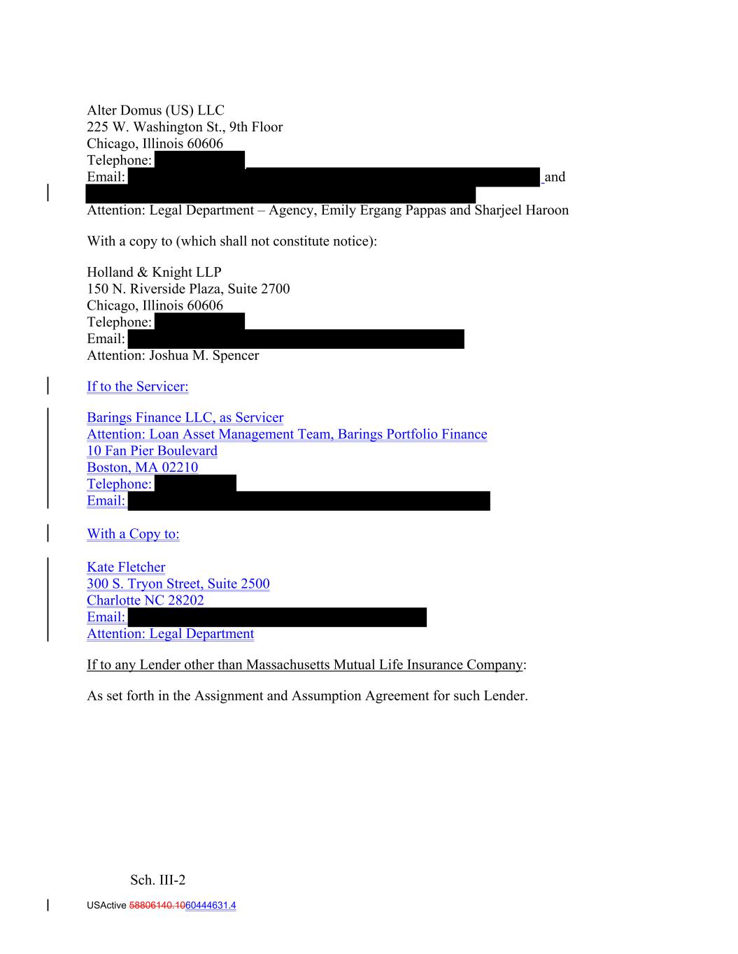 Alter Domus (US) LLC 225 W. Washington St., 9th Floor Chicago, Illinois 60606 Telephone: Email: and Attention: Legal Department – Agency, Emily Ergang Pappas and Sharjeel Haroon With a copy to (which shall not constitute notice): Holland & Knight LLP 150 N. Riverside Plaza, Suite 2700 Chicago, Illinois 60606 Telephone: Email: Attention: Joshua M. Spencer If to the Servicer: Barings Finance LLC, as Servicer Attention: Loan Asset Management Team, Barings Portfolio Finance 10 Fan Pier Boulevard Boston, MA 02210 Telephone: Email: With a Copy to: Kate Fletcher 300 S. Tryon Street, Suite 2500 Charlotte NC 28202 Email: Attention: Legal Department If to any Lender other than Massachusetts Mutual Life Insurance Company: As set forth in the Assignment and Assumption Agreement for such Lender. Sch. III-2 USActive 58806140.1060444631.4