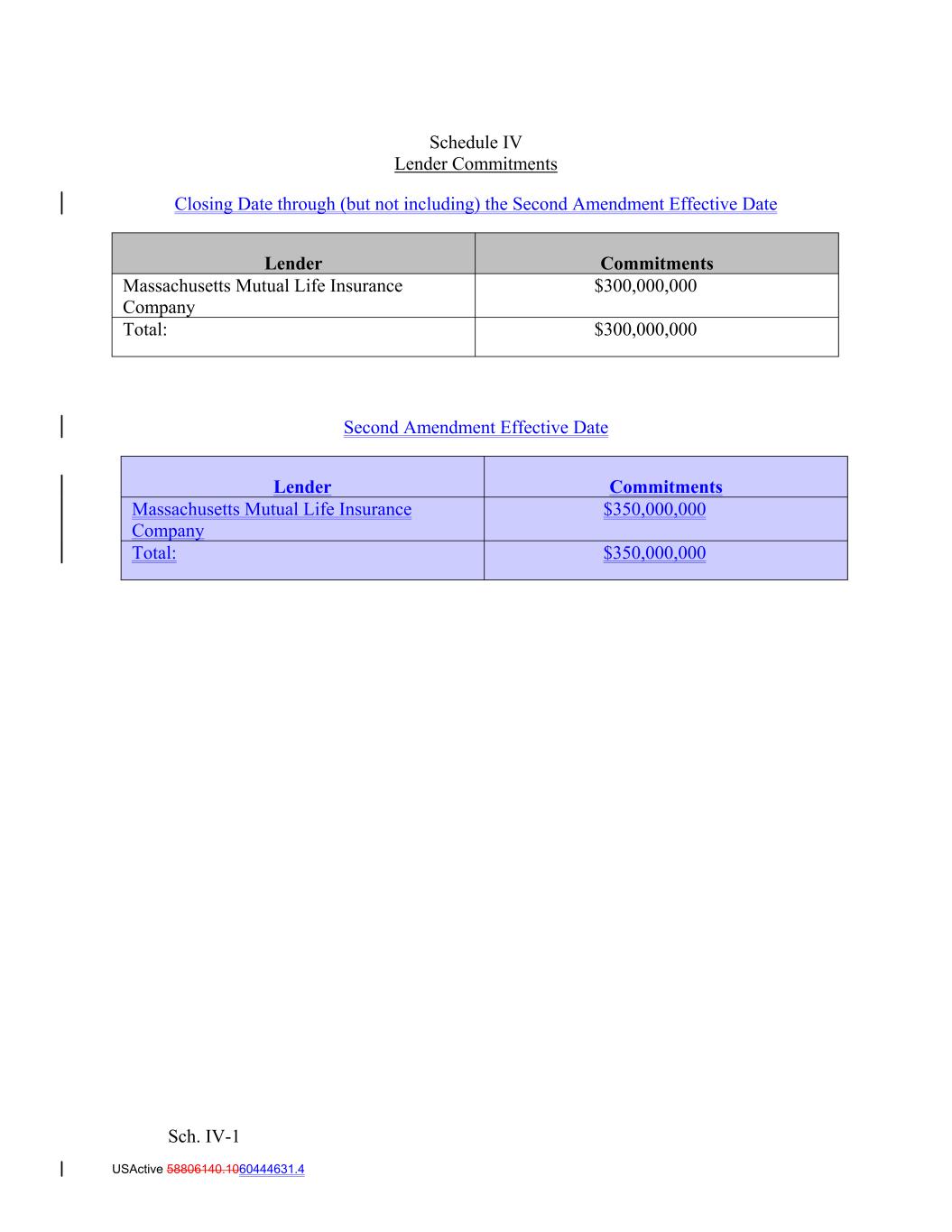 Sch. IV-1 USActive 58806140.1060444631.4 $300,000,000 Schedule IV Lender Commitments Closing Date through (but not including) the Second Amendment Effective Date Second Amendment Effective Date Lender Commitments Massachusetts Mutual Life Insurance Company Massachusetts Mutual Life Insurance Company $300,000,000 $350,000,000 Lender Total: $350,000,000 Total: Commitments