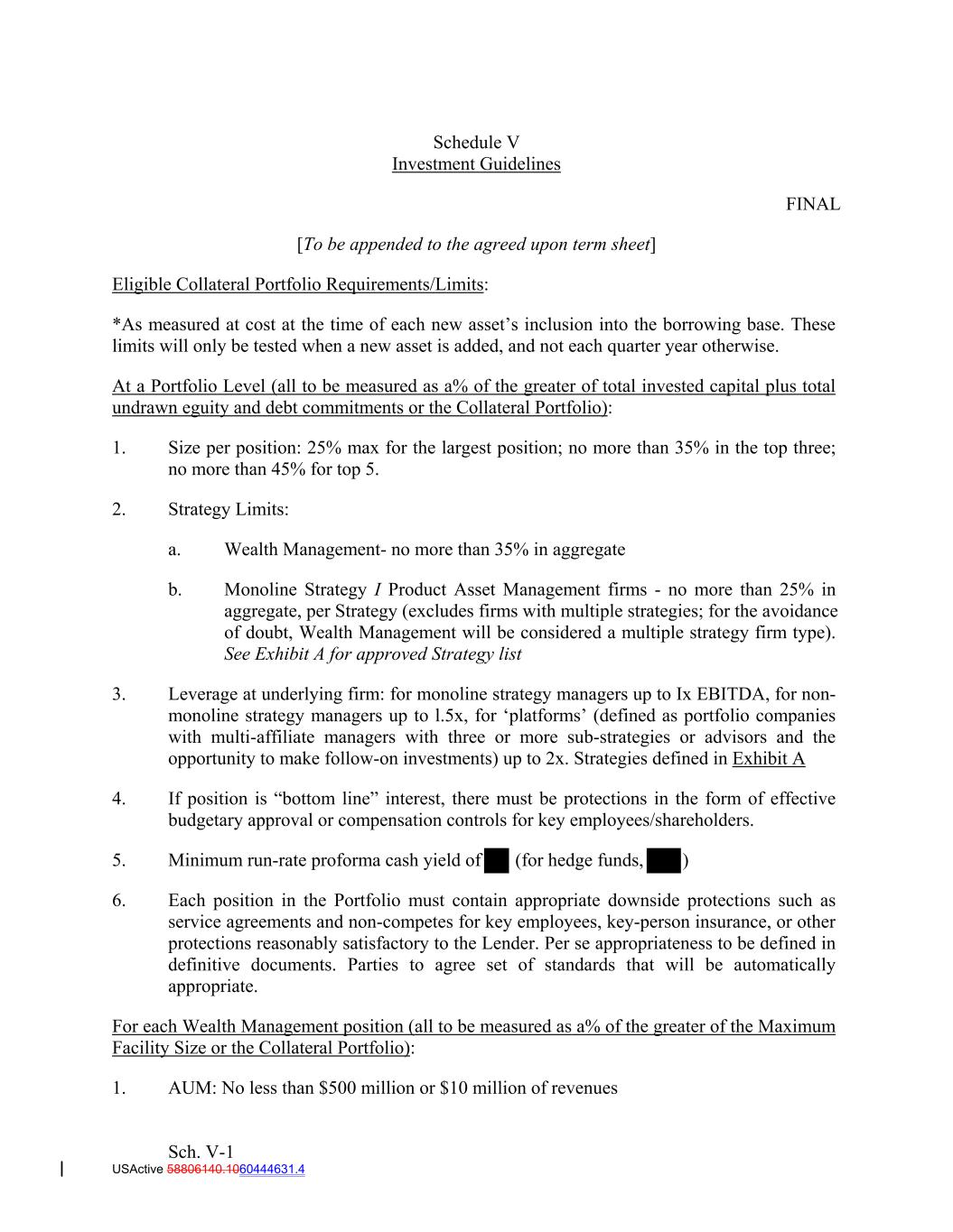 Schedule V Investment Guidelines FINAL [To be appended to the agreed upon term sheet] Eligible Collateral Portfolio Requirements/Limits: *As measured at cost at the time of each new asset’s inclusion into the borrowing base. These limits will only be tested when a new asset is added, and not each quarter year otherwise. At a Portfolio Level (all to be measured as a% of the greater of total invested capital plus total undrawn eguity and debt commitments or the Collateral Portfolio): 1. Size per position: 25% max for the largest position; no more than 35% in the top three; no more than 45% for top 5. 2. Strategy Limits: a. Wealth Management- no more than 35% in aggregate b. Monoline Strategy I Product Asset Management firms - no more than 25% in aggregate, per Strategy (excludes firms with multiple strategies; for the avoidance of doubt, Wealth Management will be considered a multiple strategy firm type). See Exhibit A for approved Strategy list 3. Leverage at underlying firm: for monoline strategy managers up to Ix EBITDA, for non- monoline strategy managers up to l.5x, for ‘platforms’ (defined as portfolio companies with multi-affiliate managers with three or more sub-strategies or advisors and the opportunity to make follow-on investments) up to 2x. Strategies defined in Exhibit A 4. If position is “bottom line” interest, there must be protections in the form of effective budgetary approval or compensation controls for key employees/shareholders. 5. Minimum run-rate proforma cash yield of (for hedge funds, ) 6. Each position in the Portfolio must contain appropriate downside protections such as service agreements and non-competes for key employees, key-person insurance, or other protections reasonably satisfactory to the Lender. Per se appropriateness to be defined in definitive documents. Parties to agree set of standards that will be automatically appropriate. For each Wealth Management position (all to be measured as a% of the greater of the Maximum Facility Size or the Collateral Portfolio): 1. AUM: No less than $500 million or $10 million of revenues Sch. V-1 USActive 58806140.1060444631.4