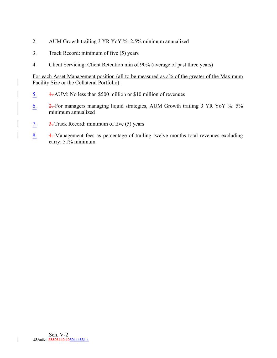 2. AUM Growth trailing 3 YR YoY %: 2.5% minimum annualized 3. Track Record: minimum of five (5) years 4. Client Servicing: Client Retention min of 90% (average of past three years) For each Asset Management position (all to be measured as a% of the greater of the Maximum Facility Size or the Collateral Portfolio): 5. 1. AUM: No less than $500 million or $10 million of revenues 6. 2. For managers managing liquid strategies, AUM Growth trailing 3 YR YoY %: 5% minimum annualized 7. 3. Track Record: minimum of five (5) years 8. 4. Management fees as percentage of trailing twelve months total revenues excluding carry: 51% minimum Sch. V-2 USActive 58806140.1060444631.4