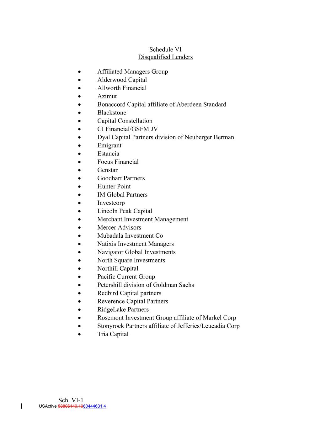 Schedule VI Disqualified Lenders  Affiliated Managers Group  Alderwood Capital  Allworth Financial  Azimut  Bonaccord Capital affiliate of Aberdeen Standard  Blackstone  Capital Constellation  CI Financial/GSFM JV  Dyal Capital Partners division of Neuberger Berman  Emigrant  Estancia  Focus Financial  Genstar  Goodhart Partners  Hunter Point  IM Global Partners  Investcorp  Lincoln Peak Capital  Merchant Investment Management  Mercer Advisors  Mubadala Investment Co  Natixis Investment Managers  Navigator Global Investments  North Square Investments  Northill Capital  Pacific Current Group  Petershill division of Goldman Sachs  Redbird Capital partners  Reverence Capital Partners  RidgeLake Partners  Rosemont Investment Group affiliate of Markel Corp  Stonyrock Partners affiliate of Jefferies/Leucadia Corp  Tria Capital Sch. VI-1 USActive 58806140.1060444631.4