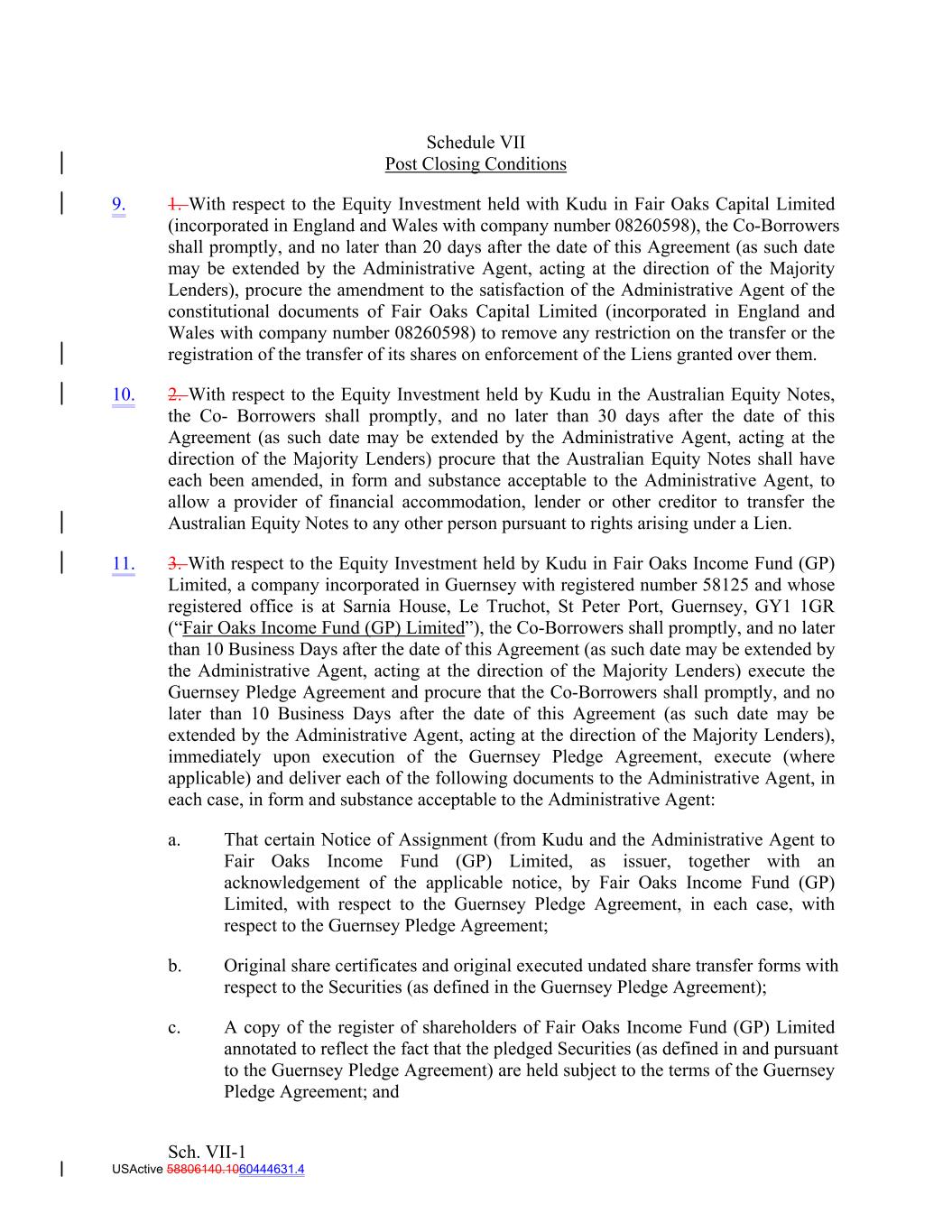 Schedule VII Post Closing Conditions 9. 1. With respect to the Equity Investment held with Kudu in Fair Oaks Capital Limited (incorporated in England and Wales with company number 08260598), the Co‐Borrowers shall promptly, and no later than 20 days after the date of this Agreement (as such date may be extended by the Administrative Agent, acting at the direction of the Majority Lenders), procure the amendment to the satisfaction of the Administrative Agent of the constitutional documents of Fair Oaks Capital Limited (incorporated in England and Wales with company number 08260598) to remove any restriction on the transfer or the registration of the transfer of its shares on enforcement of the Liens granted over them. 10. 2. With respect to the Equity Investment held by Kudu in the Australian Equity Notes, the Co‐ Borrowers shall promptly, and no later than 30 days after the date of this Agreement (as such date may be extended by the Administrative Agent, acting at the direction of the Majority Lenders) procure that the Australian Equity Notes shall have each been amended, in form and substance acceptable to the Administrative Agent, to allow a provider of financial accommodation, lender or other creditor to transfer the Australian Equity Notes to any other person pursuant to rights arising under a Lien. 11. 3. With respect to the Equity Investment held by Kudu in Fair Oaks Income Fund (GP) Limited, a company incorporated in Guernsey with registered number 58125 and whose registered office is at Sarnia House, Le Truchot, St Peter Port, Guernsey, GY1 1GR (“Fair Oaks Income Fund (GP) Limited”), the Co‐Borrowers shall promptly, and no later than 10 Business Days after the date of this Agreement (as such date may be extended by the Administrative Agent, acting at the direction of the Majority Lenders) execute the Guernsey Pledge Agreement and procure that the Co‐Borrowers shall promptly, and no later than 10 Business Days after the date of this Agreement (as such date may be extended by the Administrative Agent, acting at the direction of the Majority Lenders), immediately upon execution of the Guernsey Pledge Agreement, execute (where applicable) and deliver each of the following documents to the Administrative Agent, in each case, in form and substance acceptable to the Administrative Agent: a. That certain Notice of Assignment (from Kudu and the Administrative Agent to Fair Oaks Income Fund (GP) Limited, as issuer, together with an acknowledgement of the applicable notice, by Fair Oaks Income Fund (GP) Limited, with respect to the Guernsey Pledge Agreement, in each case, with respect to the Guernsey Pledge Agreement; b. Original share certificates and original executed undated share transfer forms with respect to the Securities (as defined in the Guernsey Pledge Agreement); c. A copy of the register of shareholders of Fair Oaks Income Fund (GP) Limited annotated to reflect the fact that the pledged Securities (as defined in and pursuant to the Guernsey Pledge Agreement) are held subject to the terms of the Guernsey Pledge Agreement; and Sch. VII-1 USActive 58806140.1060444631.4