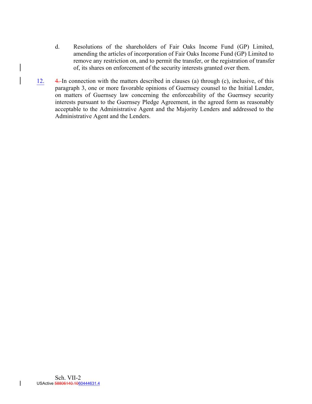 d. Resolutions of the shareholders of Fair Oaks Income Fund (GP) Limited, amending the articles of incorporation of Fair Oaks Income Fund (GP) Limited to remove any restriction on, and to permit the transfer, or the registration of transfer of, its shares on enforcement of the security interests granted over them. 12. 4. In connection with the matters described in clauses (a) through (c), inclusive, of this paragraph 3, one or more favorable opinions of Guernsey counsel to the Initial Lender, on matters of Guernsey law concerning the enforceability of the Guernsey security interests pursuant to the Guernsey Pledge Agreement, in the agreed form as reasonably acceptable to the Administrative Agent and the Majority Lenders and addressed to the Administrative Agent and the Lenders. Sch. VII-2 USActive 58806140.1060444631.4
