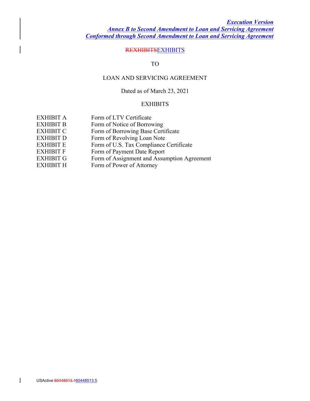 Execution Version Annex B to Second Amendment to Loan and Servicing Agreement Conformed through Second Amendment to Loan and Servicing Agreement REXHIBITSEXHIBITS TO LOAN AND SERVICING AGREEMENT Dated as of March 23, 2021 EXHIBITS EXHIBIT A Form of LTV Certificate EXHIBIT B Form of Notice of Borrowing EXHIBIT C Form of Borrowing Base Certificate EXHIBIT D Form of Revolving Loan Note EXHIBIT E Form of U.S. Tax Compliance Certificate EXHIBIT F Form of Payment Date Report EXHIBIT G Form of Assignment and Assumption Agreement EXHIBIT H Form of Power of Attorney USActive 60448513.160448513.5