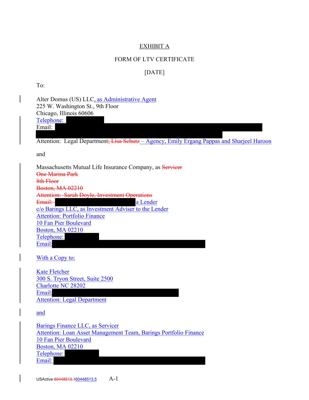 EXHIBIT A FORM OF LTV CERTIFICATE [DATE] To: Alter Domus (US) LLC, as Administrative Agent 225 W. Washington St., 9th Floor Chicago, Illinois 60606 Telephone: Email: Attention: Legal Department; Lisa Schutz – Agency, Emily Ergang Pappas and Sharjeel Haroon and Massachusetts Mutual Life Insurance Company, as Servicer One Marina Park 8th Floor Boston, MA 02210 Attention: Sarah Doyle, Investment Operations Email: a Lender c/o Barings LLC, as Investment Adviser to the Lender Attention: Portfolio Finance 10 Fan Pier Boulevard Boston, MA 02210 Telephone: Email: With a Copy to: Kate Fletcher 300 S. Tryon Street, Suite 2500 Charlotte NC 28202 Email: Attention: Legal Department and Barings Finance LLC, as Servicer Attention: Loan Asset Management Team, Barings Portfolio Finance 10 Fan Pier Boulevard Boston, MA 02210 Telephone: Email: USActive 60448513.160448513.5 A-1
