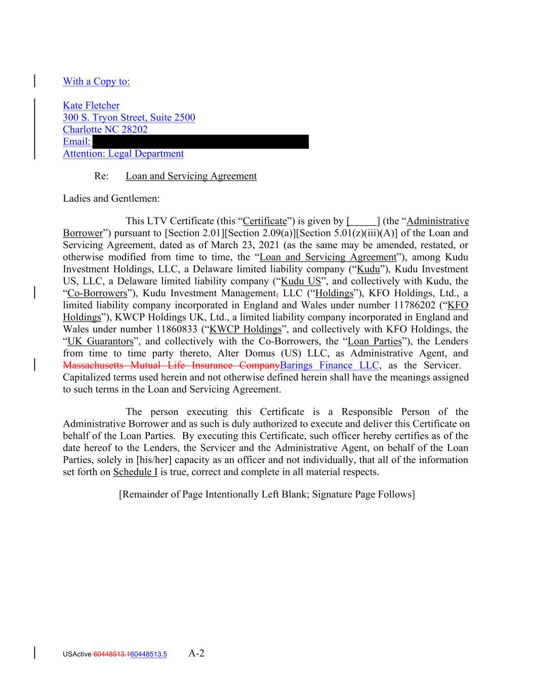 With a Copy to: Kate Fletcher 300 S. Tryon Street, Suite 2500 Charlotte NC 28202 Email: Attention: Legal Department Re: Loan and Servicing Agreement Ladies and Gentlemen: This LTV Certificate (this “Certificate”) is given by [ ] (the “Administrative Borrower”) pursuant to [Section 2.01][Section 2.09(a)][Section 5.01(z)(iii)(A)] of the Loan and Servicing Agreement, dated as of March 23, 2021 (as the same may be amended, restated, or otherwise modified from time to time, the “Loan and Servicing Agreement”), among Kudu Investment Holdings, LLC, a Delaware limited liability company (“Kudu”), Kudu Investment US, LLC, a Delaware limited liability company (“Kudu US”, and collectively with Kudu, the “Co-Borrowers”), Kudu Investment Management, LLC (“Holdings”), KFO Holdings, Ltd., a limited liability company incorporated in England and Wales under number 11786202 (“KFO Holdings”), KWCP Holdings UK, Ltd., a limited liability company incorporated in England and Wales under number 11860833 (“KWCP Holdings”, and collectively with KFO Holdings, the “UK Guarantors”, and collectively with the Co-Borrowers, the “Loan Parties”), the Lenders from time to time party thereto, Alter Domus (US) LLC, as Administrative Agent, and Massachusetts Mutual Life Insurance CompanyBarings Finance LLC, as the Servicer. Capitalized terms used herein and not otherwise defined herein shall have the meanings assigned to such terms in the Loan and Servicing Agreement. The person executing this Certificate is a Responsible Person of the Administrative Borrower and as such is duly authorized to execute and deliver this Certificate on behalf of the Loan Parties. By executing this Certificate, such officer hereby certifies as of the date hereof to the Lenders, the Servicer and the Administrative Agent, on behalf of the Loan Parties, solely in [his/her] capacity as an officer and not individually, that all of the information set forth on Schedule I is true, correct and complete in all material respects. [Remainder of Page Intentionally Left Blank; Signature Page Follows] USActive 60448513.160448513.5 A-2