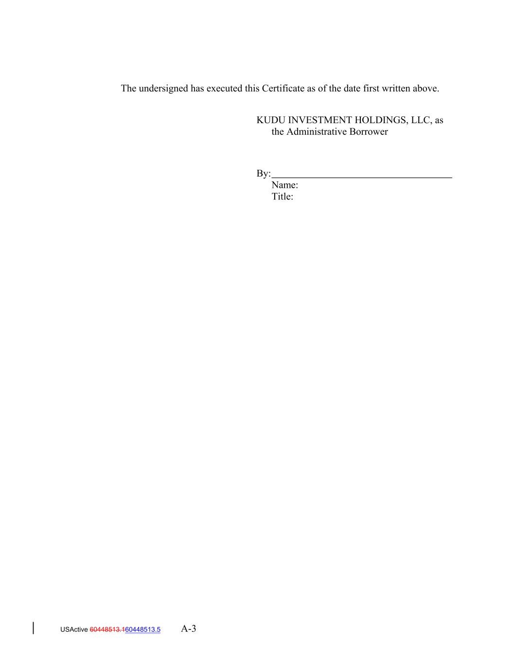 The undersigned has executed this Certificate as of the date first written above. KUDU INVESTMENT HOLDINGS, LLC, as the Administrative Borrower By: Name: Title: USActive 60448513.160448513.5 A-3