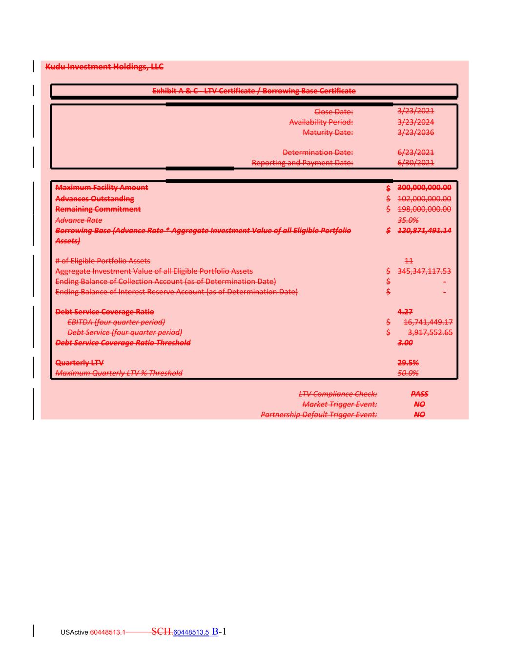 USActive 60448513.1 SCH.60448513.5 B-1 6/23/2021 Borrowing Base (Advance Rate * Aggregate Investment Value of all Eligible Portfolio Assets) $ 120,871,491.14 Reporting and Payment Date: Availability Period: 6/30/2021 # of Eligible Portfolio Assets 3/23/2024 11 Aggregate Investment Value of all Eligible Portfolio Assets $ 345,347,117.53 Ending Balance of Collection Account (as of Determination Date) $ ‐ Ending Balance of Interest Reserve Account (as of Determination Date) Exhibit A & C ‐ LTV Certificate / Borrowing Base Certificate $ ‐ Maximum Facility Amount Kudu Investment Holdings, LLC $ Maturity Date: 300,000,000.00 Debt Service Coverage Ratio 3/23/2036 4.27 Advances Outstanding EBITDA (four quarter period) $ 16,741,449.17 $ 102,000,000.00 Debt Service (four quarter period) $ 3,917,552.65 Debt Service Coverage Ratio Threshold Remaining Commitment 3.00 $ 198,000,000.00 Close Date: Quarterly LTV 29.5% Maximum Quarterly LTV % Threshold 3/23/2021 50.0% LTV Compliance Check: PASS Advance Rate Market Trigger Event: NO Partnership Default Trigger Event: Determination Date: NO 35.0%