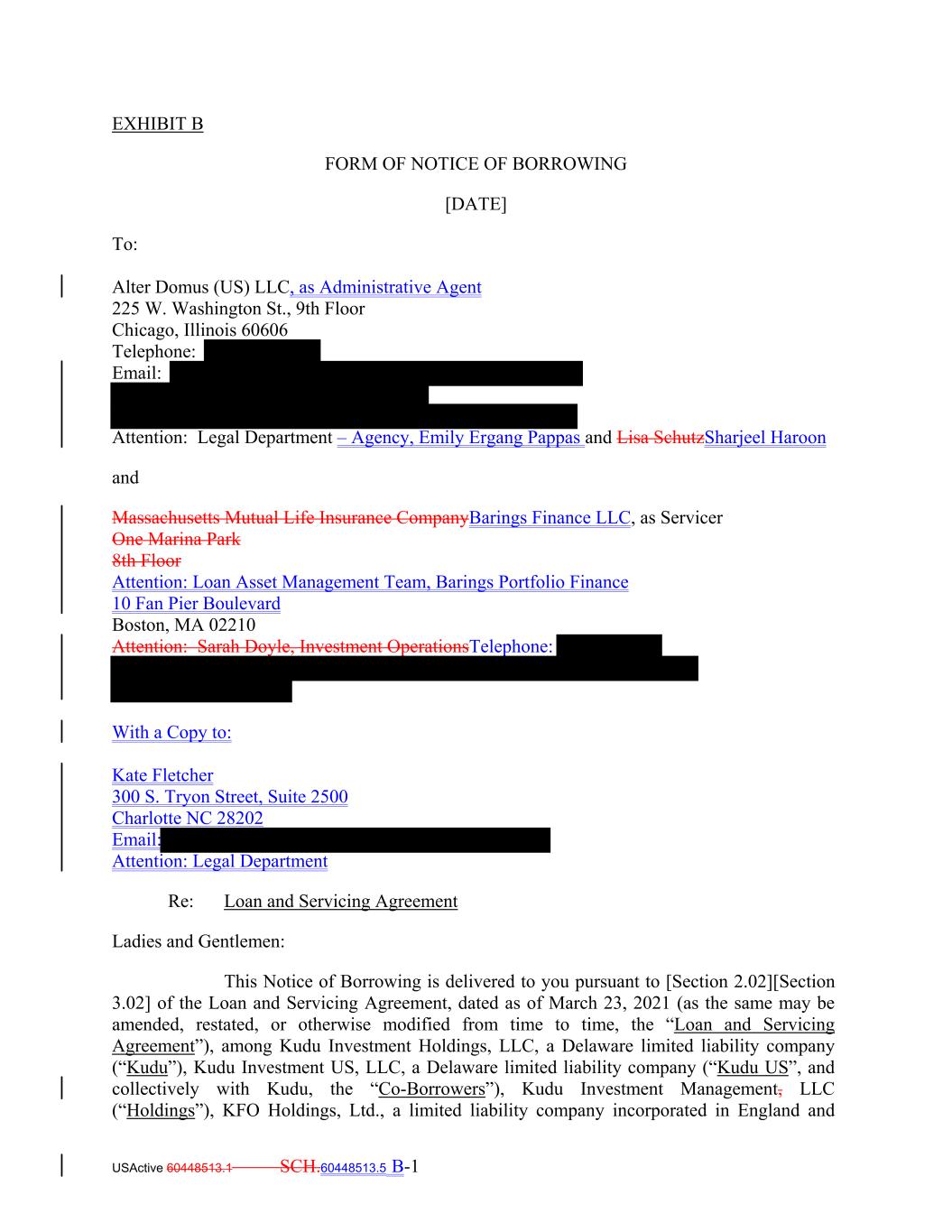EXHIBIT B FORM OF NOTICE OF BORROWING [DATE] To: Alter Domus (US) LLC, as Administrative Agent 225 W. Washington St., 9th Floor Chicago, Illinois 60606 Telephone: Email: Attention: Legal Department – Agency, Emily Ergang Pappas and Lisa SchutzSharjeel Haroon and Massachusetts Mutual Life Insurance CompanyBarings Finance LLC, as Servicer One Marina Park 8th Floor Attention: Loan Asset Management Team, Barings Portfolio Finance 10 Fan Pier Boulevard Boston, MA 02210 Attention: Sarah Doyle, Investment OperationsTelephone: With a Copy to: Kate Fletcher 300 S. Tryon Street, Suite 2500 Charlotte NC 28202 Email: Attention: Legal Department Re: Loan and Servicing Agreement Ladies and Gentlemen: This Notice of Borrowing is delivered to you pursuant to [Section 2.02][Section 3.02] of the Loan and Servicing Agreement, dated as of March 23, 2021 (as the same may be amended, restated, or otherwise modified from time to time, the “Loan and Servicing Agreement”), among Kudu Investment Holdings, LLC, a Delaware limited liability company (“Kudu”), Kudu Investment US, LLC, a Delaware limited liability company (“Kudu US”, and collectively with Kudu, the “Co-Borrowers”), Kudu Investment Management, LLC (“Holdings”), KFO Holdings, Ltd., a limited liability company incorporated in England and USActive 60448513.1 SCH.60448513.5 B-1