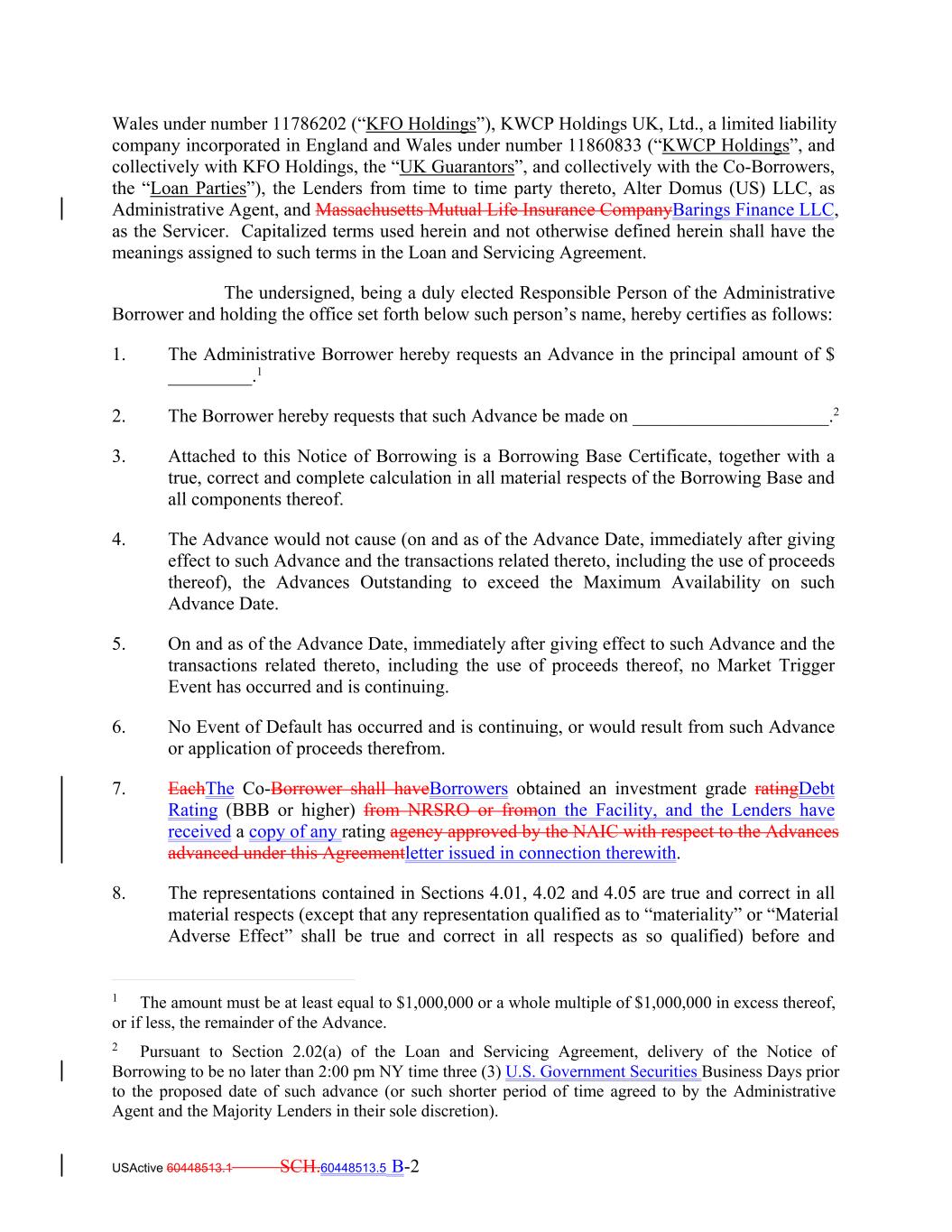 USActive 60448513.1 SCH.60448513.5 B-2 2. The Borrower hereby requests that such Advance be made on _____________________.2 3. Attached to this Notice of Borrowing is a Borrowing Base Certificate, together with a true, correct and complete calculation in all material respects of the Borrowing Base and all components thereof. 4. The Advance would not cause (on and as of the Advance Date, immediately after giving effect to such Advance and the transactions related thereto, including the use of proceeds thereof), the Advances Outstanding to exceed the Maximum Availability on such Advance Date. 5. On and as of the Advance Date, immediately after giving effect to such Advance and the transactions related thereto, including the use of proceeds thereof, no Market Trigger Event has occurred and is continuing. 6. No Event of Default has occurred and is continuing, or would result from such Advance or application of proceeds therefrom. 7. EachThe Co-Borrower shall haveBorrowers obtained an investment grade ratingDebt Rating (BBB or higher) from NRSRO or fromon the Facility, and the Lenders have received a copy of any rating agency approved by the NAIC with respect to the Advances advanced under this Agreementletter issued in connection therewith. 8. The representations contained in Sections 4.01, 4.02 and 4.05 are true and correct in all material respects (except that any representation qualified as to “materiality” or “Material Adverse Effect” shall be true and correct in all respects as so qualified) before and Wales under number 11786202 (“KFO Holdings”), KWCP Holdings UK, Ltd., a limited liability company incorporated in England and Wales under number 11860833 (“KWCP Holdings”, and collectively with KFO Holdings, the “UK Guarantors”, and collectively with the Co-Borrowers, the “Loan Parties”), the Lenders from time to time party thereto, Alter Domus (US) LLC, as Administrative Agent, and Massachusetts Mutual Life Insurance CompanyBarings Finance LLC, as the Servicer. Capitalized terms used herein and not otherwise defined herein shall have the meanings assigned to such terms in the Loan and Servicing Agreement. The undersigned, being a duly elected Responsible Person of the Administrative Borrower and holding the office set forth below such person’s name, hereby certifies as follows: 1. The Administrative Borrower hereby requests an Advance in the principal amount of $ _________.1 1 The amount must be at least equal to $1,000,000 or a whole multiple of $1,000,000 in excess thereof, or if less, the remainder of the Advance. 2 Pursuant to Section 2.02(a) of the Loan and Servicing Agreement, delivery of the Notice of Borrowing to be no later than 2:00 pm NY time three (3) U.S. Government Securities Business Days prior to the proposed date of such advance (or such shorter period of time agreed to by the Administrative Agent and the Majority Lenders in their sole discretion).