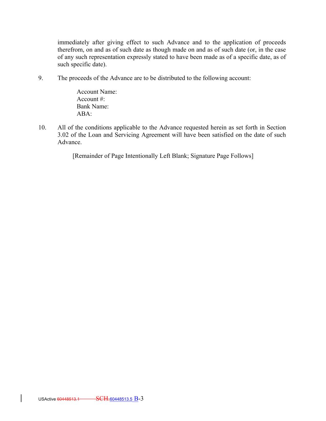 immediately after giving effect to such Advance and to the application of proceeds therefrom, on and as of such date as though made on and as of such date (or, in the case of any such representation expressly stated to have been made as of a specific date, as of such specific date). 9. The proceeds of the Advance are to be distributed to the following account: Account Name: Account #: Bank Name: ABA: 10. All of the conditions applicable to the Advance requested herein as set forth in Section 3.02 of the Loan and Servicing Agreement will have been satisfied on the date of such Advance. [Remainder of Page Intentionally Left Blank; Signature Page Follows] USActive 60448513.1 SCH.60448513.5 B-3