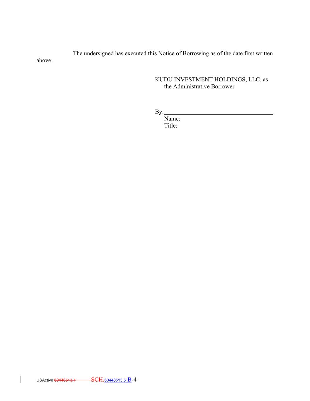 The undersigned has executed this Notice of Borrowing as of the date first written above. KUDU INVESTMENT HOLDINGS, LLC, as the Administrative Borrower By: Name: Title: USActive 60448513.1 SCH.60448513.5 B-4