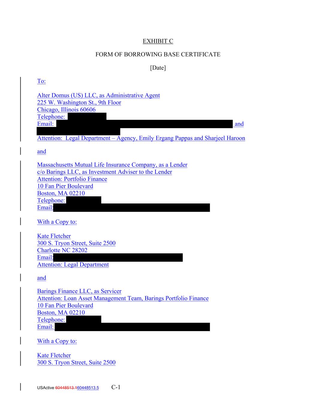 EXHIBIT C FORM OF BORROWING BASE CERTIFICATE [Date] To: Alter Domus (US) LLC, as Administrative Agent 225 W. Washington St., 9th Floor Chicago, Illinois 60606 Telephone: Email: and Attention: Legal Department – Agency, Emily Ergang Pappas and Sharjeel Haroon and Massachusetts Mutual Life Insurance Company, as a Lender c/o Barings LLC, as Investment Adviser to the Lender Attention: Portfolio Finance 10 Fan Pier Boulevard Boston, MA 02210 Telephone: Email: With a Copy to: Kate Fletcher 300 S. Tryon Street, Suite 2500 Charlotte NC 28202 Email: Attention: Legal Department and Barings Finance LLC, as Servicer Attention: Loan Asset Management Team, Barings Portfolio Finance 10 Fan Pier Boulevard Boston, MA 02210 Telephone: Email: With a Copy to: Kate Fletcher 300 S. Tryon Street, Suite 2500 USActive 60448513.160448513.5 C-1