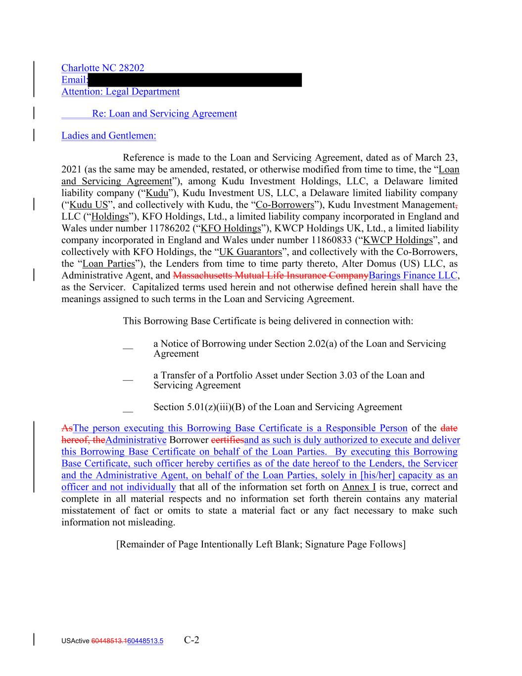 Charlotte NC 28202 Email: Attention: Legal Department Re: Loan and Servicing Agreement Ladies and Gentlemen: Reference is made to the Loan and Servicing Agreement, dated as of March 23, 2021 (as the same may be amended, restated, or otherwise modified from time to time, the “Loan and Servicing Agreement”), among Kudu Investment Holdings, LLC, a Delaware limited liability company (“Kudu”), Kudu Investment US, LLC, a Delaware limited liability company (“Kudu US”, and collectively with Kudu, the “Co-Borrowers”), Kudu Investment Management, LLC (“Holdings”), KFO Holdings, Ltd., a limited liability company incorporated in England and Wales under number 11786202 (“KFO Holdings”), KWCP Holdings UK, Ltd., a limited liability company incorporated in England and Wales under number 11860833 (“KWCP Holdings”, and collectively with KFO Holdings, the “UK Guarantors”, and collectively with the Co-Borrowers, the “Loan Parties”), the Lenders from time to time party thereto, Alter Domus (US) LLC, as Administrative Agent, and Massachusetts Mutual Life Insurance CompanyBarings Finance LLC, as the Servicer. Capitalized terms used herein and not otherwise defined herein shall have the meanings assigned to such terms in the Loan and Servicing Agreement. This Borrowing Base Certificate is being delivered in connection with: __ a Notice of Borrowing under Section 2.02(a) of the Loan and Servicing Agreement __ a Transfer of a Portfolio Asset under Section 3.03 of the Loan and Servicing Agreement __ Section 5.01(z)(iii)(B) of the Loan and Servicing Agreement AsThe person executing this Borrowing Base Certificate is a Responsible Person of the date hereof, theAdministrative Borrower certifiesand as such is duly authorized to execute and deliver this Borrowing Base Certificate on behalf of the Loan Parties. By executing this Borrowing Base Certificate, such officer hereby certifies as of the date hereof to the Lenders, the Servicer and the Administrative Agent, on behalf of the Loan Parties, solely in [his/her] capacity as an officer and not individually that all of the information set forth on Annex I is true, correct and complete in all material respects and no information set forth therein contains any material misstatement of fact or omits to state a material fact or any fact necessary to make such information not misleading. [Remainder of Page Intentionally Left Blank; Signature Page Follows] USActive 60448513.160448513.5 C-2