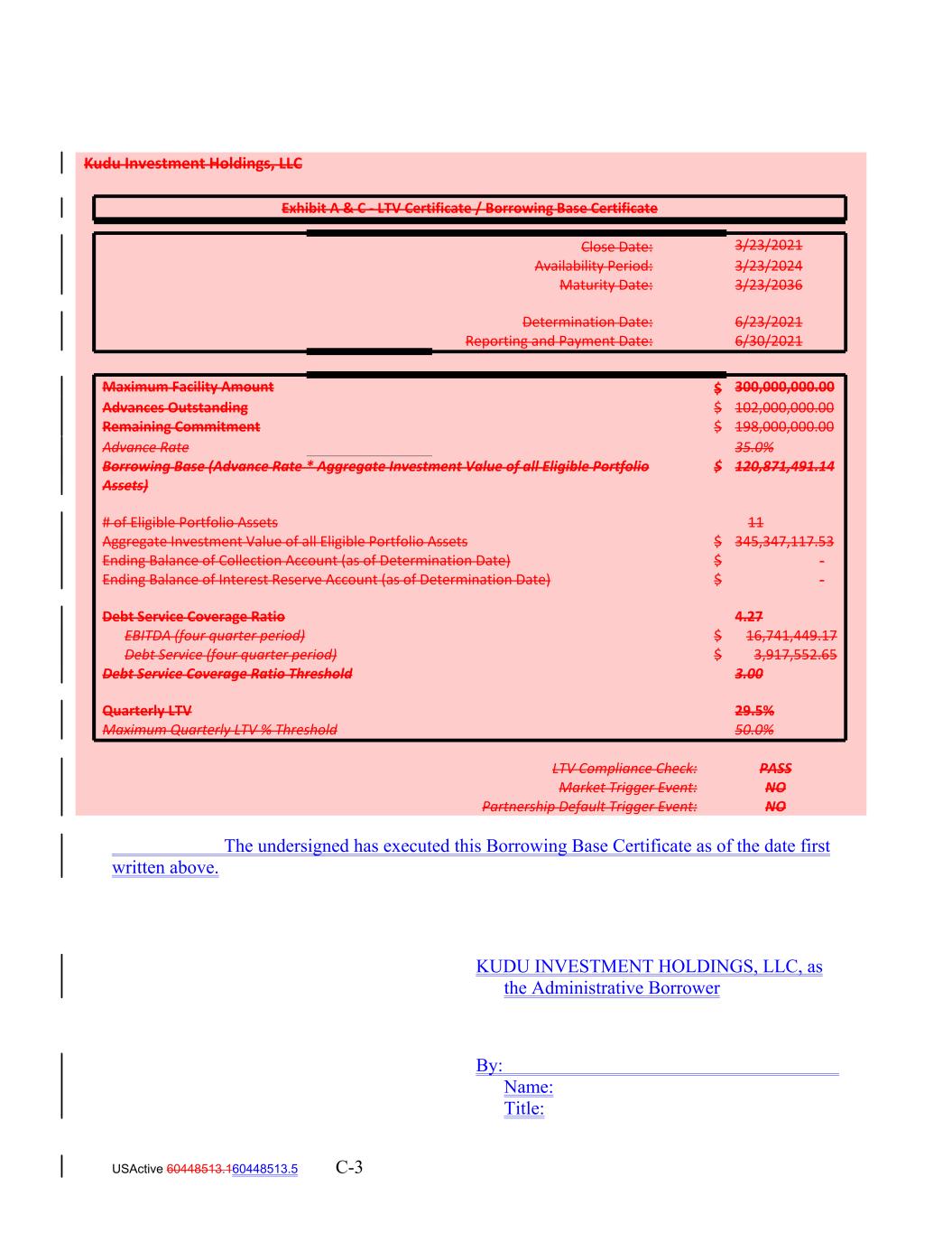 USActive 60448513.160448513.5 C-3 6/23/2021 Borrowing Base (Advance Rate * Aggregate Investment Value of all Eligible Portfolio Assets) $ 120,871,491.14 Reporting and Payment Date: # of Eligible Portfolio Assets 6/30/2021 Availability Period: 11 3/23/2024 Aggregate Investment Value of all Eligible Portfolio Assets $ 345,347,117.53 Ending Balance of Collection Account (as of Determination Date) $ ‐ Ending Balance of Interest Reserve Account (as of Determination Date) $ ‐ Maximum Facility Amount $ 300,000,000.00 Maturity Date: Debt Service Coverage Ratio Exhibit A & C ‐ LTV Certificate / Borrowing Base Certificate 3/23/2036 4.27 Advances Outstanding EBITDA (four quarter period) $ 16,741,449.17 $ Debt Service (four quarter period) 102,000,000.00 $ 3,917,552.65 Debt Service Coverage Ratio Threshold 3.00 Remaining Commitment $ 198,000,000.00 Quarterly LTV 29.5% Close Date: Maximum Quarterly LTV % Threshold 50.0% 3/23/2021 LTV Compliance Check: PASS Advance Rate Market Trigger Event: NO Kudu Investment Holdings, LLC Partnership Default Trigger Event: NO 35.0% The undersigned has executed this Borrowing Base Certificate as of the date first written above. KUDU INVESTMENT HOLDINGS, LLC, as the Administrative Borrower By: Name: Title: Determination Date: