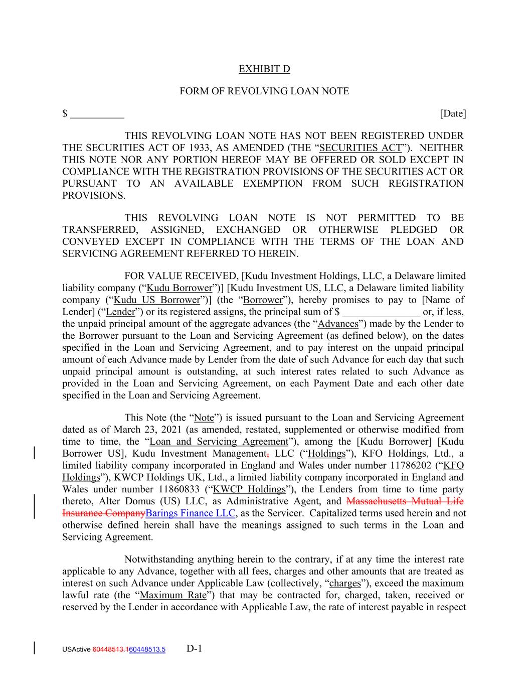 EXHIBIT D FORM OF REVOLVING LOAN NOTE $ [Date] THIS REVOLVING LOAN NOTE HAS NOT BEEN REGISTERED UNDER THE SECURITIES ACT OF 1933, AS AMENDED (THE “SECURITIES ACT”). NEITHER THIS NOTE NOR ANY PORTION HEREOF MAY BE OFFERED OR SOLD EXCEPT IN COMPLIANCE WITH THE REGISTRATION PROVISIONS OF THE SECURITIES ACT OR PURSUANT TO AN AVAILABLE EXEMPTION FROM SUCH REGISTRATION PROVISIONS. THIS REVOLVING LOAN NOTE IS NOT PERMITTED TO BE TRANSFERRED, ASSIGNED, EXCHANGED OR OTHERWISE PLEDGED OR CONVEYED EXCEPT IN COMPLIANCE WITH THE TERMS OF THE LOAN AND SERVICING AGREEMENT REFERRED TO HEREIN. FOR VALUE RECEIVED, [Kudu Investment Holdings, LLC, a Delaware limited liability company (“Kudu Borrower”)] [Kudu Investment US, LLC, a Delaware limited liability company (“Kudu US Borrower”)] (the “Borrower”), hereby promises to pay to [Name of Lender] (“Lender”) or its registered assigns, the principal sum of $ _______________ or, if less, the unpaid principal amount of the aggregate advances (the “Advances”) made by the Lender to the Borrower pursuant to the Loan and Servicing Agreement (as defined below), on the dates specified in the Loan and Servicing Agreement, and to pay interest on the unpaid principal amount of each Advance made by Lender from the date of such Advance for each day that such unpaid principal amount is outstanding, at such interest rates related to such Advance as provided in the Loan and Servicing Agreement, on each Payment Date and each other date specified in the Loan and Servicing Agreement. This Note (the “Note”) is issued pursuant to the Loan and Servicing Agreement dated as of March 23, 2021 (as amended, restated, supplemented or otherwise modified from time to time, the “Loan and Servicing Agreement”), among the [Kudu Borrower] [Kudu Borrower US], Kudu Investment Management, LLC (“Holdings”), KFO Holdings, Ltd., a limited liability company incorporated in England and Wales under number 11786202 (“KFO Holdings”), KWCP Holdings UK, Ltd., a limited liability company incorporated in England and Wales under number 11860833 (“KWCP Holdings”), the Lenders from time to time party thereto, Alter Domus (US) LLC, as Administrative Agent, and Massachusetts Mutual Life Insurance CompanyBarings Finance LLC, as the Servicer. Capitalized terms used herein and not otherwise defined herein shall have the meanings assigned to such terms in the Loan and Servicing Agreement. Notwithstanding anything herein to the contrary, if at any time the interest rate applicable to any Advance, together with all fees, charges and other amounts that are treated as interest on such Advance under Applicable Law (collectively, “charges”), exceed the maximum lawful rate (the “Maximum Rate”) that may be contracted for, charged, taken, received or reserved by the Lender in accordance with Applicable Law, the rate of interest payable in respect USActive 60448513.160448513.5 D-1