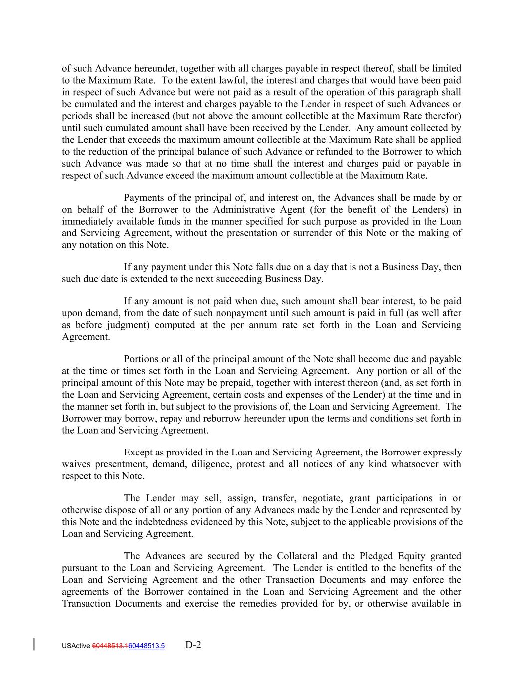 of such Advance hereunder, together with all charges payable in respect thereof, shall be limited to the Maximum Rate. To the extent lawful, the interest and charges that would have been paid in respect of such Advance but were not paid as a result of the operation of this paragraph shall be cumulated and the interest and charges payable to the Lender in respect of such Advances or periods shall be increased (but not above the amount collectible at the Maximum Rate therefor) until such cumulated amount shall have been received by the Lender. Any amount collected by the Lender that exceeds the maximum amount collectible at the Maximum Rate shall be applied to the reduction of the principal balance of such Advance or refunded to the Borrower to which such Advance was made so that at no time shall the interest and charges paid or payable in respect of such Advance exceed the maximum amount collectible at the Maximum Rate. Payments of the principal of, and interest on, the Advances shall be made by or on behalf of the Borrower to the Administrative Agent (for the benefit of the Lenders) in immediately available funds in the manner specified for such purpose as provided in the Loan and Servicing Agreement, without the presentation or surrender of this Note or the making of any notation on this Note. If any payment under this Note falls due on a day that is not a Business Day, then such due date is extended to the next succeeding Business Day. If any amount is not paid when due, such amount shall bear interest, to be paid upon demand, from the date of such nonpayment until such amount is paid in full (as well after as before judgment) computed at the per annum rate set forth in the Loan and Servicing Agreement. Portions or all of the principal amount of the Note shall become due and payable at the time or times set forth in the Loan and Servicing Agreement. Any portion or all of the principal amount of this Note may be prepaid, together with interest thereon (and, as set forth in the Loan and Servicing Agreement, certain costs and expenses of the Lender) at the time and in the manner set forth in, but subject to the provisions of, the Loan and Servicing Agreement. The Borrower may borrow, repay and reborrow hereunder upon the terms and conditions set forth in the Loan and Servicing Agreement. Except as provided in the Loan and Servicing Agreement, the Borrower expressly waives presentment, demand, diligence, protest and all notices of any kind whatsoever with respect to this Note. The Lender may sell, assign, transfer, negotiate, grant participations in or otherwise dispose of all or any portion of any Advances made by the Lender and represented by this Note and the indebtedness evidenced by this Note, subject to the applicable provisions of the Loan and Servicing Agreement. The Advances are secured by the Collateral and the Pledged Equity granted pursuant to the Loan and Servicing Agreement. The Lender is entitled to the benefits of the Loan and Servicing Agreement and the other Transaction Documents and may enforce the agreements of the Borrower contained in the Loan and Servicing Agreement and the other Transaction Documents and exercise the remedies provided for by, or otherwise available in USActive 60448513.160448513.5 D-2
