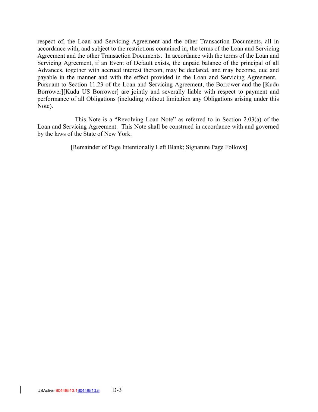 respect of, the Loan and Servicing Agreement and the other Transaction Documents, all in accordance with, and subject to the restrictions contained in, the terms of the Loan and Servicing Agreement and the other Transaction Documents. In accordance with the terms of the Loan and Servicing Agreement, if an Event of Default exists, the unpaid balance of the principal of all Advances, together with accrued interest thereon, may be declared, and may become, due and payable in the manner and with the effect provided in the Loan and Servicing Agreement. Pursuant to Section 11.23 of the Loan and Servicing Agreement, the Borrower and the [Kudu Borrower][Kudu US Borrower] are jointly and severally liable with respect to payment and performance of all Obligations (including without limitation any Obligations arising under this Note). This Note is a “Revolving Loan Note” as referred to in Section 2.03(a) of the Loan and Servicing Agreement. This Note shall be construed in accordance with and governed by the laws of the State of New York. [Remainder of Page Intentionally Left Blank; Signature Page Follows] USActive 60448513.160448513.5 D-3
