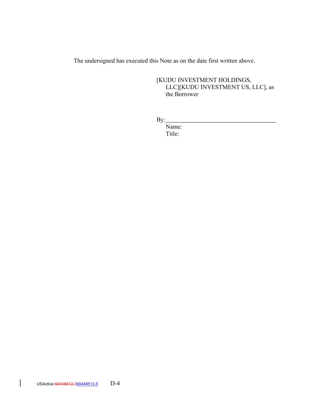 The undersigned has executed this Note as on the date first written above. [KUDU INVESTMENT HOLDINGS, LLC][KUDU INVESTMENT US, LLC], as the Borrower By: Name: Title: USActive 60448513.160448513.5 D-4