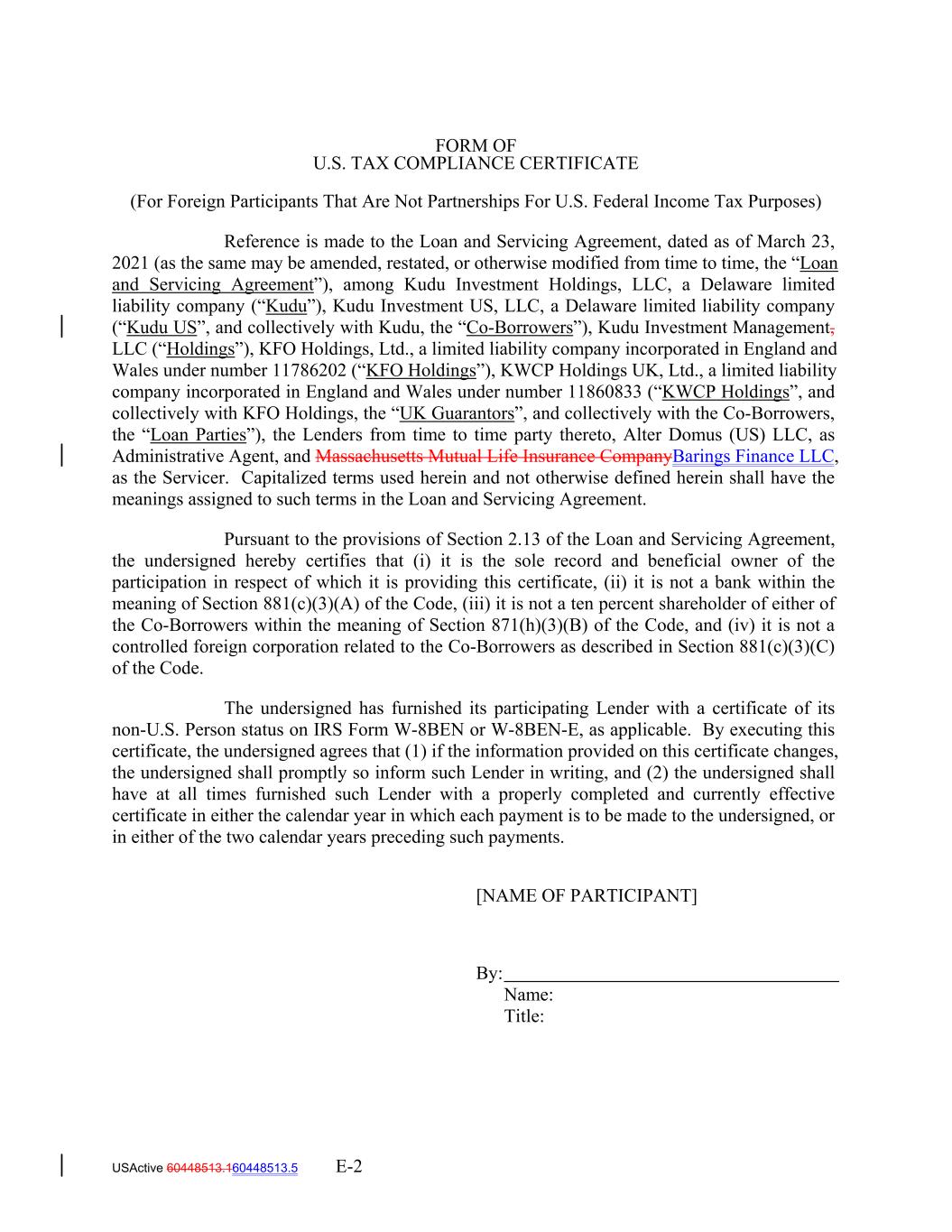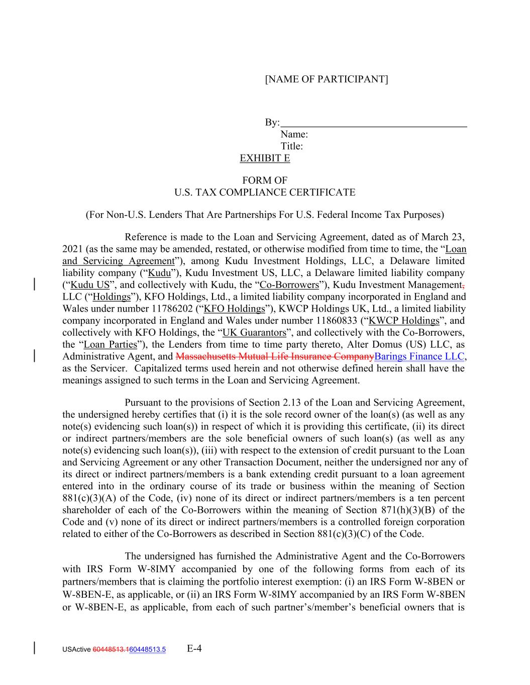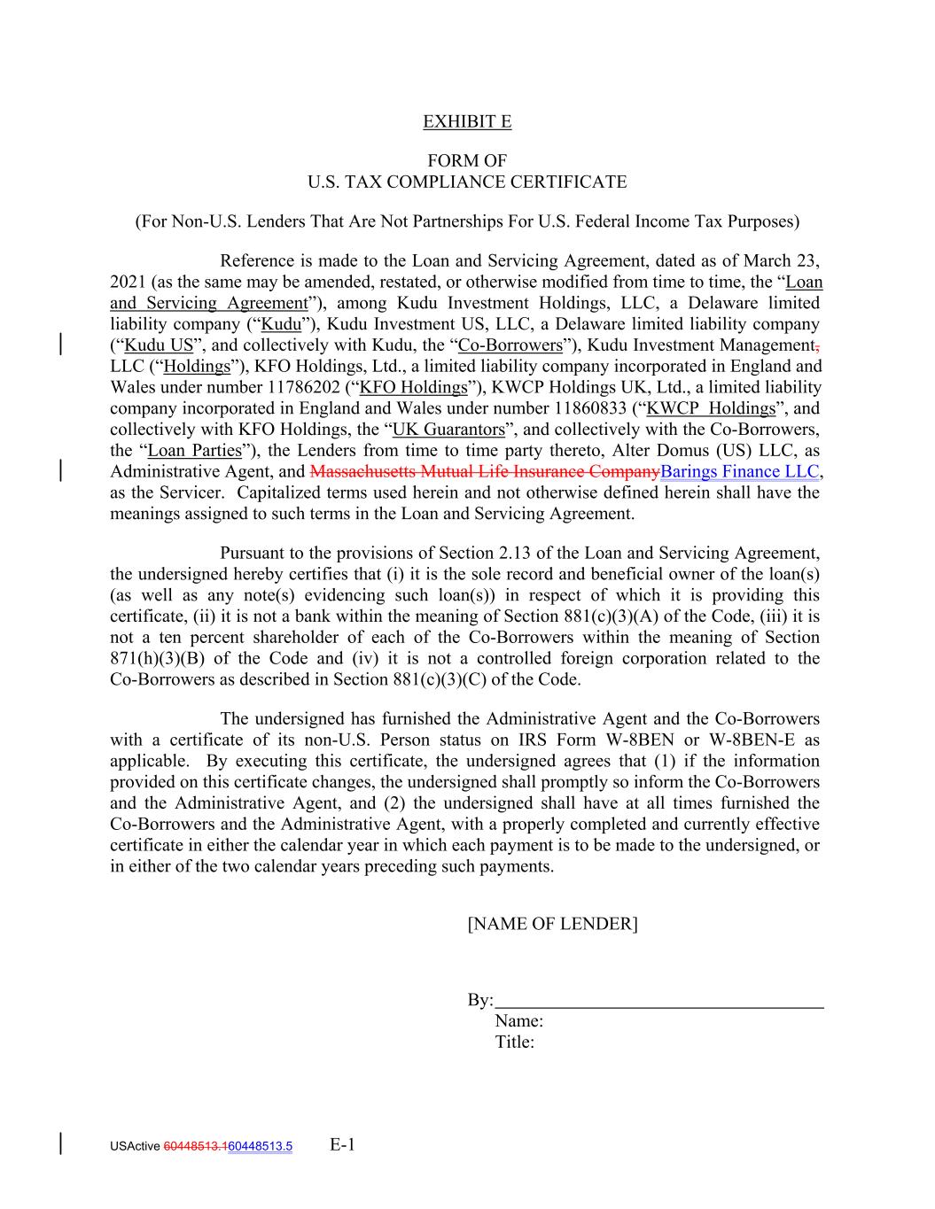 [NAME OF PARTICIPANT] By: Name: Title: EXHIBIT E FORM OF U.S. TAX COMPLIANCE CERTIFICATE (For Non-U.S. Lenders That Are Partnerships For U.S. Federal Income Tax Purposes) Reference is made to the Loan and Servicing Agreement, dated as of March 23, 2021 (as the same may be amended, restated, or otherwise modified from time to time, the “Loan and Servicing Agreement”), among Kudu Investment Holdings, LLC, a Delaware limited liability company (“Kudu”), Kudu Investment US, LLC, a Delaware limited liability company (“Kudu US”, and collectively with Kudu, the “Co-Borrowers”), Kudu Investment Management, LLC (“Holdings”), KFO Holdings, Ltd., a limited liability company incorporated in England and Wales under number 11786202 (“KFO Holdings”), KWCP Holdings UK, Ltd., a limited liability company incorporated in England and Wales under number 11860833 (“KWCP Holdings”, and collectively with KFO Holdings, the “UK Guarantors”, and collectively with the Co-Borrowers, the “Loan Parties”), the Lenders from time to time party thereto, Alter Domus (US) LLC, as Administrative Agent, and Massachusetts Mutual Life Insurance CompanyBarings Finance LLC, as the Servicer. Capitalized terms used herein and not otherwise defined herein shall have the meanings assigned to such terms in the Loan and Servicing Agreement. Pursuant to the provisions of Section 2.13 of the Loan and Servicing Agreement, the undersigned hereby certifies that (i) it is the sole record owner of the loan(s) (as well as any note(s) evidencing such loan(s)) in respect of which it is providing this certificate, (ii) its direct or indirect partners/members are the sole beneficial owners of such loan(s) (as well as any note(s) evidencing such loan(s)), (iii) with respect to the extension of credit pursuant to the Loan and Servicing Agreement or any other Transaction Document, neither the undersigned nor any of its direct or indirect partners/members is a bank extending credit pursuant to a loan agreement entered into in the ordinary course of its trade or business within the meaning of Section 881(c)(3)(A) of the Code, (iv) none of its direct or indirect partners/members is a ten percent shareholder of each of the Co-Borrowers within the meaning of Section 871(h)(3)(B) of the Code and (v) none of its direct or indirect partners/members is a controlled foreign corporation related to either of the Co-Borrowers as described in Section 881(c)(3)(C) of the Code. The undersigned has furnished the Administrative Agent and the Co-Borrowers with IRS Form W‐8IMY accompanied by one of the following forms from each of its partners/members that is claiming the portfolio interest exemption: (i) an IRS Form W-8BEN or W-8BEN-E, as applicable, or (ii) an IRS Form W‐8IMY accompanied by an IRS Form W-8BEN or W-8BEN-E, as applicable, from each of such partner’s/member’s beneficial owners that is USActive 60448513.160448513.5 E-4