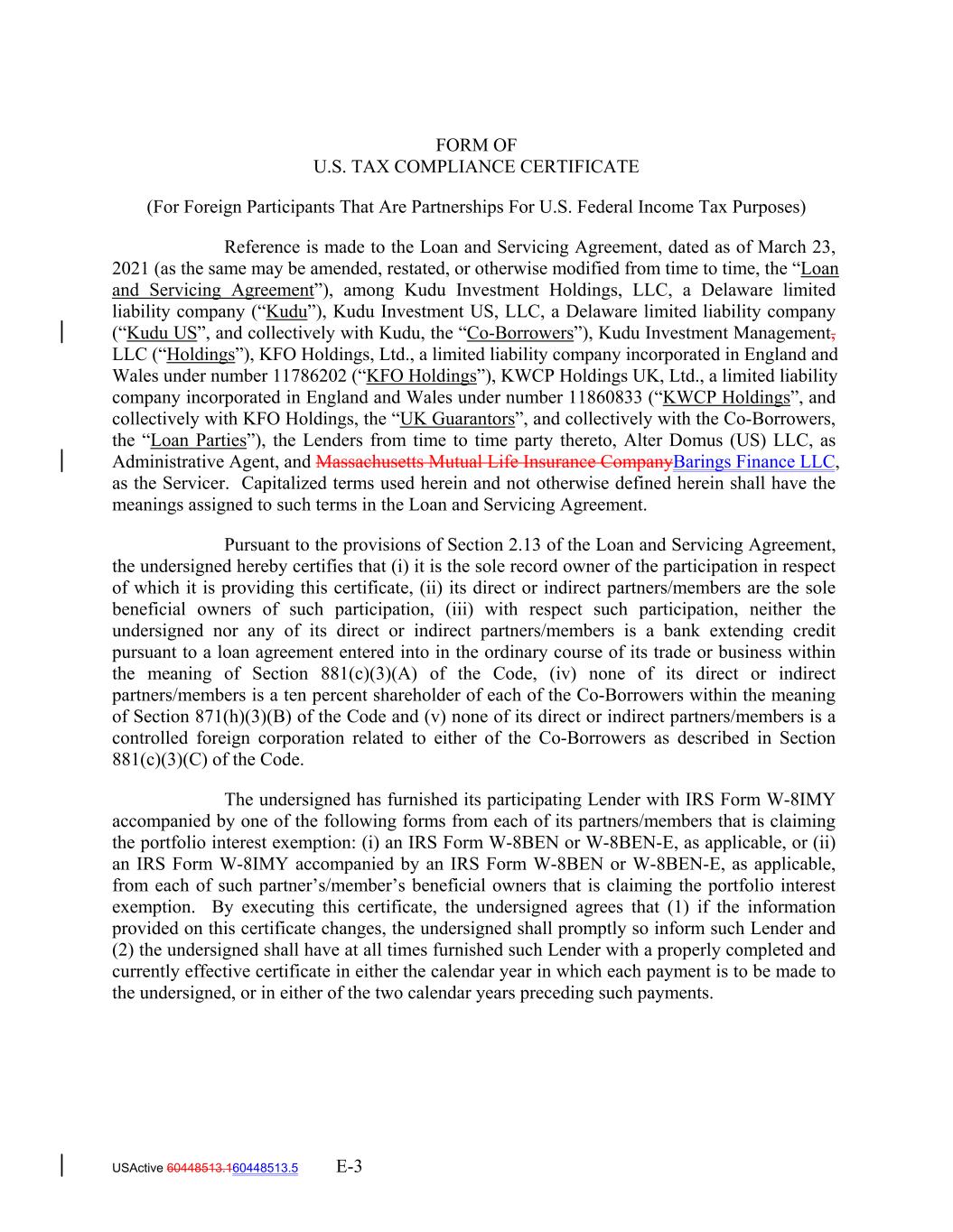 FORM OF U.S. TAX COMPLIANCE CERTIFICATE (For Foreign Participants That Are Partnerships For U.S. Federal Income Tax Purposes) Reference is made to the Loan and Servicing Agreement, dated as of March 23, 2021 (as the same may be amended, restated, or otherwise modified from time to time, the “Loan and Servicing Agreement”), among Kudu Investment Holdings, LLC, a Delaware limited liability company (“Kudu”), Kudu Investment US, LLC, a Delaware limited liability company (“Kudu US”, and collectively with Kudu, the “Co-Borrowers”), Kudu Investment Management, LLC (“Holdings”), KFO Holdings, Ltd., a limited liability company incorporated in England and Wales under number 11786202 (“KFO Holdings”), KWCP Holdings UK, Ltd., a limited liability company incorporated in England and Wales under number 11860833 (“KWCP Holdings”, and collectively with KFO Holdings, the “UK Guarantors”, and collectively with the Co-Borrowers, the “Loan Parties”), the Lenders from time to time party thereto, Alter Domus (US) LLC, as Administrative Agent, and Massachusetts Mutual Life Insurance CompanyBarings Finance LLC, as the Servicer. Capitalized terms used herein and not otherwise defined herein shall have the meanings assigned to such terms in the Loan and Servicing Agreement. Pursuant to the provisions of Section 2.13 of the Loan and Servicing Agreement, the undersigned hereby certifies that (i) it is the sole record owner of the participation in respect of which it is providing this certificate, (ii) its direct or indirect partners/members are the sole beneficial owners of such participation, (iii) with respect such participation, neither the undersigned nor any of its direct or indirect partners/members is a bank extending credit pursuant to a loan agreement entered into in the ordinary course of its trade or business within the meaning of Section 881(c)(3)(A) of the Code, (iv) none of its direct or indirect partners/members is a ten percent shareholder of each of the Co-Borrowers within the meaning of Section 871(h)(3)(B) of the Code and (v) none of its direct or indirect partners/members is a controlled foreign corporation related to either of the Co-Borrowers as described in Section 881(c)(3)(C) of the Code. The undersigned has furnished its participating Lender with IRS Form W-8IMY accompanied by one of the following forms from each of its partners/members that is claiming the portfolio interest exemption: (i) an IRS Form W-8BEN or W-8BEN-E, as applicable, or (ii) an IRS Form W-8IMY accompanied by an IRS Form W-8BEN or W-8BEN-E, as applicable, from each of such partner’s/member’s beneficial owners that is claiming the portfolio interest exemption. By executing this certificate, the undersigned agrees that (1) if the information provided on this certificate changes, the undersigned shall promptly so inform such Lender and (2) the undersigned shall have at all times furnished such Lender with a properly completed and currently effective certificate in either the calendar year in which each payment is to be made to the undersigned, or in either of the two calendar years preceding such payments. USActive 60448513.160448513.5 E-3