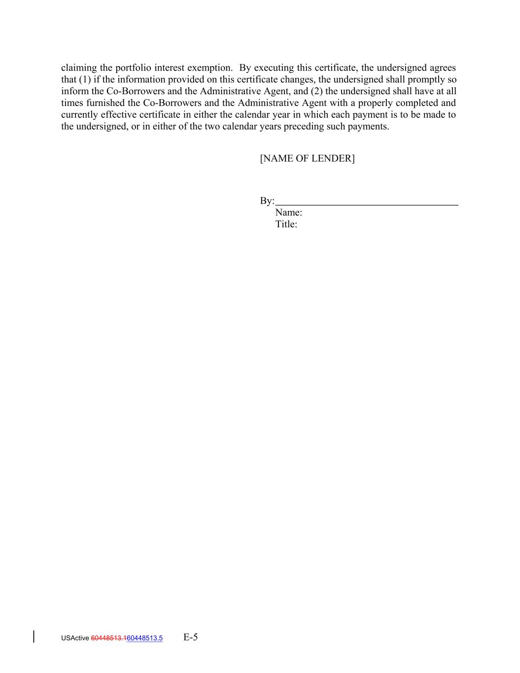 claiming the portfolio interest exemption. By executing this certificate, the undersigned agrees that (1) if the information provided on this certificate changes, the undersigned shall promptly so inform the Co-Borrowers and the Administrative Agent, and (2) the undersigned shall have at all times furnished the Co-Borrowers and the Administrative Agent with a properly completed and currently effective certificate in either the calendar year in which each payment is to be made to the undersigned, or in either of the two calendar years preceding such payments. [NAME OF LENDER] By: Name: Title: USActive 60448513.160448513.5 E-5