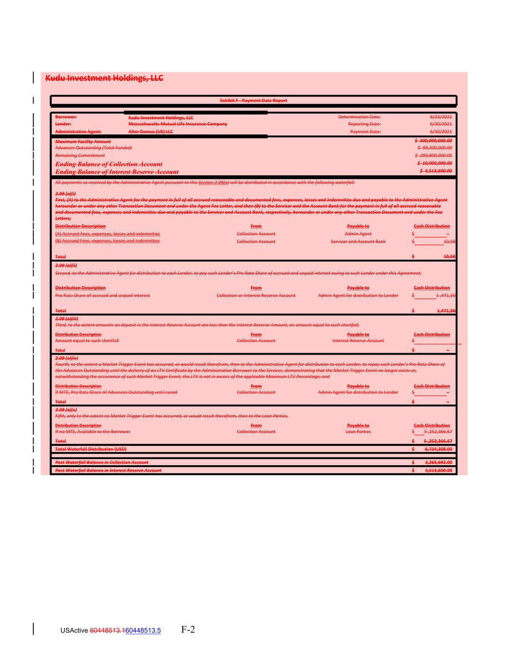 USActive 60448513.160448513.5 F-2 Total Maximum Facility Amount First, (A) to the Administrative Agent for the payment in full of all accrued reasonable and documented fees, expenses, losses and indemnities due and payable to the Administrative Agent hereunder or under any other Transaction Document and under the Agent Fee Letter, and then (B) to the Servicer and the Account Bank for the payment in full of all accrued reasonable and documented fees, expenses and indemnities due and payable to the Servicer and Account Bank, respectively, hereunder or under any other Transaction Document and under the Fee Letters; $ 1,471,360 Borrower: 2.09 (a)(iii) $  300,000,000.00 Third, to the extent amounts on deposit in the Interest Reserve Account are less than the Interest Reserve Amount, an amount equal to such shortfall; Kudu Investment Holdings, LLC Determination Date: Advances Outstanding (Total Funded) Distribution Description Distribution Description From Payable to From Cash Distribution Payable to 6/23/2021 Cash Distribution Amount equal to such shortfall $  99,200,000.00 Collection Account Interest Reserve Account $ (A) Accrued Fees, expenses, losses and indemnities Collection Account Admin Agent $ – Total Remaining Commitment $ – Kudu Investment Holdings, LLC 2.09 (a)(iv) (B) Accrued Fees, expenses, losses and indemnities Collection Account $  200,800,000.00 Servicer and Account Bank $ 10,581 Fourth, to the extent a Market Trigger Event has occurred, or would result therefrom, then to the Administrative Agent for distribution to each Lender, to repay such Lender’s Pro Rata Share of the Advances Outstanding until the delivery of an LTV Certificate by the Administrative Borrower to the Servicer, demonstrating that the Market Trigger Event no longer exists or, notwithstanding the occurrence of such Market Trigger Event, the LTV is not in excess of the applicable Maximum LTV Percentage; and Lender: Massachusetts Mutual Life Insurance Company Distribution Description From Ending Balance of Collection Account Payable to Cash Distribution If MTE, Pro Rata Share of Advances Outstanding until cured Reporting Date: Collection Account Admin Agent for distribution to Lender $ – Total $  10,000,000.00 6/30/2021 $ 10,581 Total $ – 2.09 (a)(ii) 2.09 (a)(v) Ending Balance of Interest Reserve Account Fifth, only to the extent no Market Trigger Event has occurred, or would result therefrom, then to the Loan Parties. Second, to the Administrative Agent for distribution to each Lender, to pay such Lender’s Pro Rata Share of accrued and unpaid interest owing to such Lender under this Agreement; $  4,513,600.00 Distribution Description From Administrative Agent: Payable to Cash Distribution If no MTE, Available to the Borrower Collection Account Loan Parties Alter Domus (US) LLC $ 5 ,252,366.67 All payments so received by the Administrative Agent pursuant to this Section 2.09(a) will be distributed in accordance with the following waterfall: Distribution Description From Payment Date: Payable to Cash Distribution Total $ 5 ,252,366.67 6/30/2021 2.09 (a)(i) Total Waterfall Distribution (USD) Pro Rata Share of accrued and unpaid interest Collection or Interest Reserve Account $  6,734,308.00 Admin Agent for distribution to Lender $ 1 ,471,360 Post Waterfall Balance in Collection Account $ 3,265,692.00 Exhibit F ‐ Payment Date Report Post Waterfall Balance in Interest Reserve Account $ 4,513,600.00