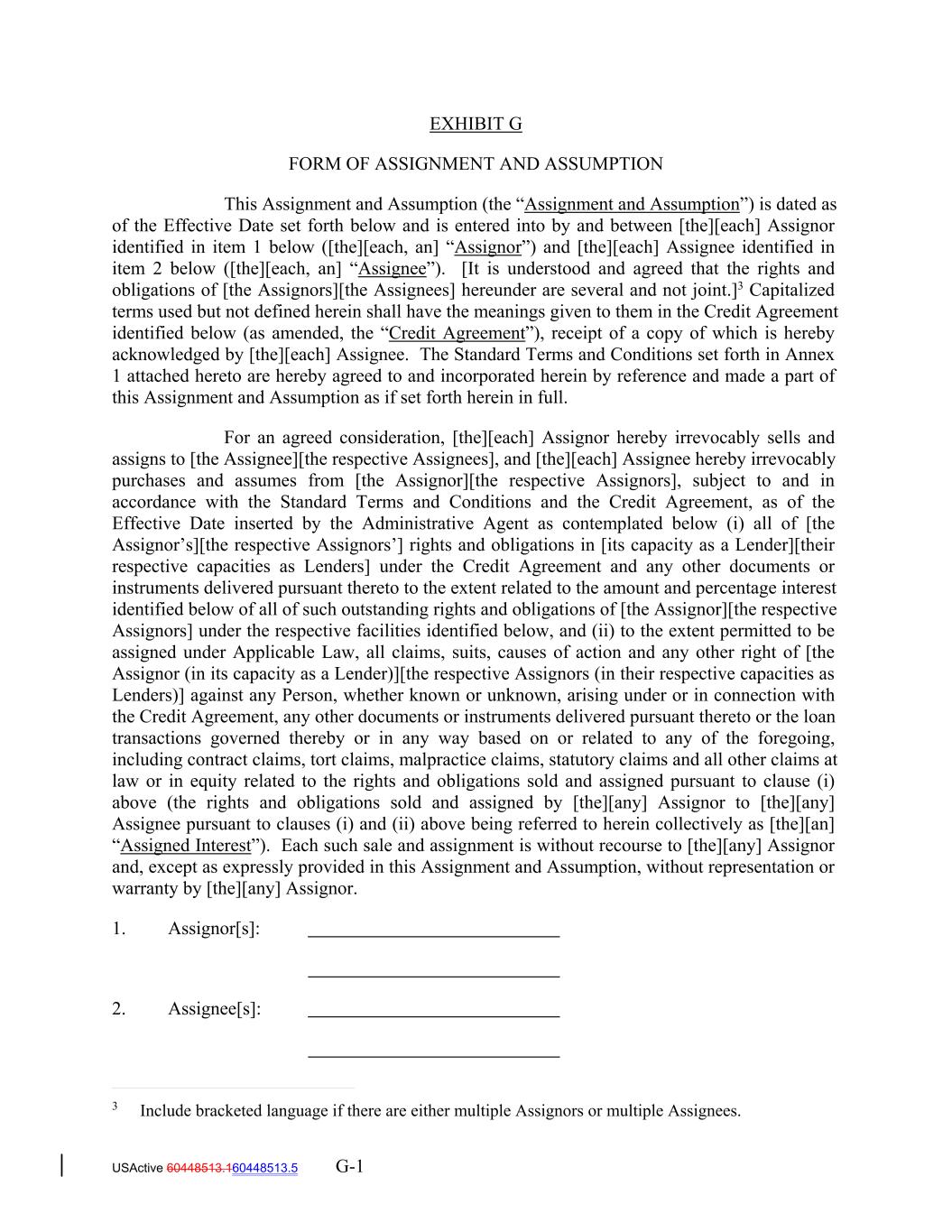 USActive 60448513.160448513.5 G-1 This Assignment and Assumption (the “Assignment and Assumption”) is dated as of the Effective Date set forth below and is entered into by and between [the][each] Assignor identified in item 1 below ([the][each, an] “Assignor”) and [the][each] Assignee identified in item 2 below ([the][each, an] “Assignee”). [It is understood and agreed that the rights and obligations of [the Assignors][the Assignees] hereunder are several and not joint.]3 Capitalized terms used but not defined herein shall have the meanings given to them in the Credit Agreement identified below (as amended, the “Credit Agreement”), receipt of a copy of which is hereby acknowledged by [the][each] Assignee. The Standard Terms and Conditions set forth in Annex 1 attached hereto are hereby agreed to and incorporated herein by reference and made a part of this Assignment and Assumption as if set forth herein in full. For an agreed consideration, [the][each] Assignor hereby irrevocably sells and assigns to [the Assignee][the respective Assignees], and [the][each] Assignee hereby irrevocably purchases and assumes from [the Assignor][the respective Assignors], subject to and in accordance with the Standard Terms and Conditions and the Credit Agreement, as of the Effective Date inserted by the Administrative Agent as contemplated below (i) all of [the Assignor’s][the respective Assignors’] rights and obligations in [its capacity as a Lender][their respective capacities as Lenders] under the Credit Agreement and any other documents or instruments delivered pursuant thereto to the extent related to the amount and percentage interest identified below of all of such outstanding rights and obligations of [the Assignor][the respective Assignors] under the respective facilities identified below, and (ii) to the extent permitted to be assigned under Applicable Law, all claims, suits, causes of action and any other right of [the Assignor (in its capacity as a Lender)][the respective Assignors (in their respective capacities as Lenders)] against any Person, whether known or unknown, arising under or in connection with the Credit Agreement, any other documents or instruments delivered pursuant thereto or the loan transactions governed thereby or in any way based on or related to any of the foregoing, including contract claims, tort claims, malpractice claims, statutory claims and all other claims at law or in equity related to the rights and obligations sold and assigned pursuant to clause (i) above (the rights and obligations sold and assigned by [the][any] Assignor to [the][any] Assignee pursuant to clauses (i) and (ii) above being referred to herein collectively as [the][an] “Assigned Interest”). Each such sale and assignment is without recourse to [the][any] Assignor and, except as expressly provided in this Assignment and Assumption, without representation or warranty by [the][any] Assignor. 1. Assignor[s]: 2. Assignee[s]: EXHIBIT G FORM OF ASSIGNMENT AND ASSUMPTION 3 Include bracketed language if there are either multiple Assignors or multiple Assignees.