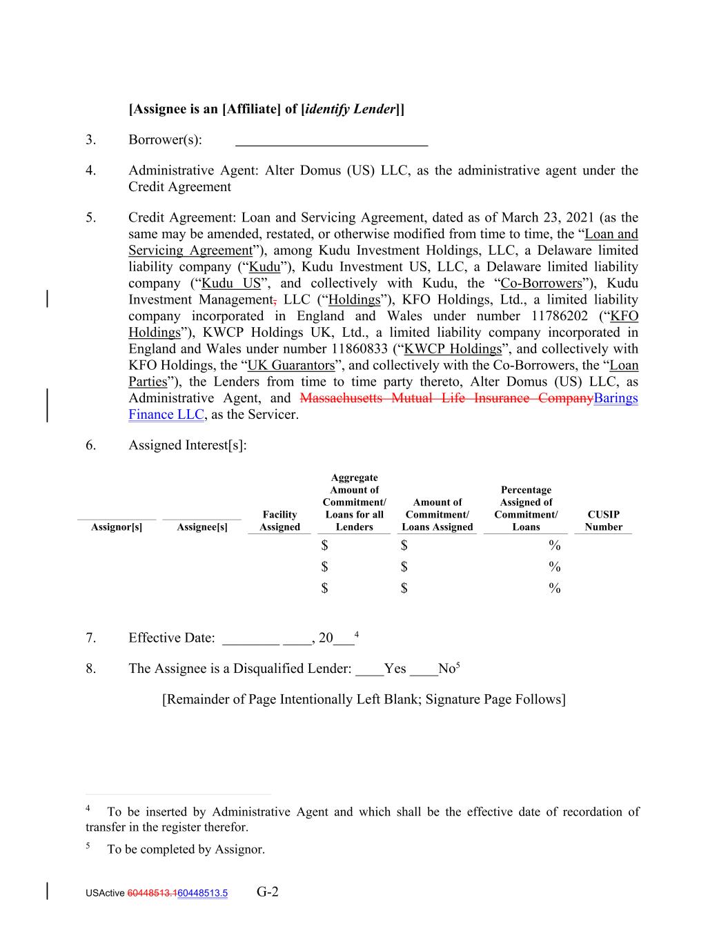 USActive 60448513.160448513.5 G-2 CUSIP Number Facility Assigned $ $ % Aggregate Amount of Commitment/ Loans for all LendersAssignor[s] $ Amount of Commitment/ Loans Assigned $ $ $ [Assignee is an [Affiliate] of [identify Lender]] 3. Borrower(s): 4. Administrative Agent: Alter Domus (US) LLC, as the administrative agent under the Credit Agreement 5. Credit Agreement: Loan and Servicing Agreement, dated as of March 23, 2021 (as the same may be amended, restated, or otherwise modified from time to time, the “Loan and Servicing Agreement”), among Kudu Investment Holdings, LLC, a Delaware limited liability company (“Kudu”), Kudu Investment US, LLC, a Delaware limited liability company (“Kudu US”, and collectively with Kudu, the “Co-Borrowers”), Kudu Investment Management, LLC (“Holdings”), KFO Holdings, Ltd., a limited liability company incorporated in England and Wales under number 11786202 (“KFO Holdings”), KWCP Holdings UK, Ltd., a limited liability company incorporated in England and Wales under number 11860833 (“KWCP Holdings”, and collectively with KFO Holdings, the “UK Guarantors”, and collectively with the Co-Borrowers, the “Loan Parties”), the Lenders from time to time party thereto, Alter Domus (US) LLC, as Administrative Agent, and Massachusetts Mutual Life Insurance CompanyBarings Finance LLC, as the Servicer. 6. Assigned Interest[s]: % % Percentage Assigned of Commitment/ Loans 7. Effective Date: ________ ____, 20___4 8. The Assignee is a Disqualified Lender: ____Yes ____No5 [Remainder of Page Intentionally Left Blank; Signature Page Follows] Assignee[s] 4 To be inserted by Administrative Agent and which shall be the effective date of recordation of transfer in the register therefor. 5 To be completed by Assignor.