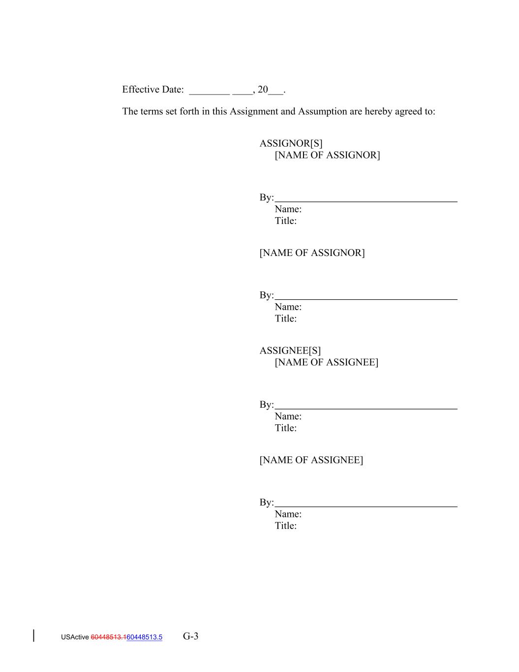 Effective Date: ________ ____, 20___. The terms set forth in this Assignment and Assumption are hereby agreed to: ASSIGNOR[S] [NAME OF ASSIGNOR] By: Name: Title: [NAME OF ASSIGNOR] By: Name: Title: ASSIGNEE[S] [NAME OF ASSIGNEE] By: Name: Title: [NAME OF ASSIGNEE] By: Name: Title: USActive 60448513.160448513.5 G-3