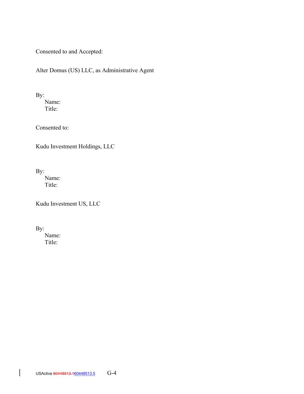 Consented to and Accepted: Alter Domus (US) LLC, as Administrative Agent By: Name: Title: Consented to: Kudu Investment Holdings, LLC By: Name: Title: Kudu Investment US, LLC By: Name: Title: USActive 60448513.160448513.5 G-4