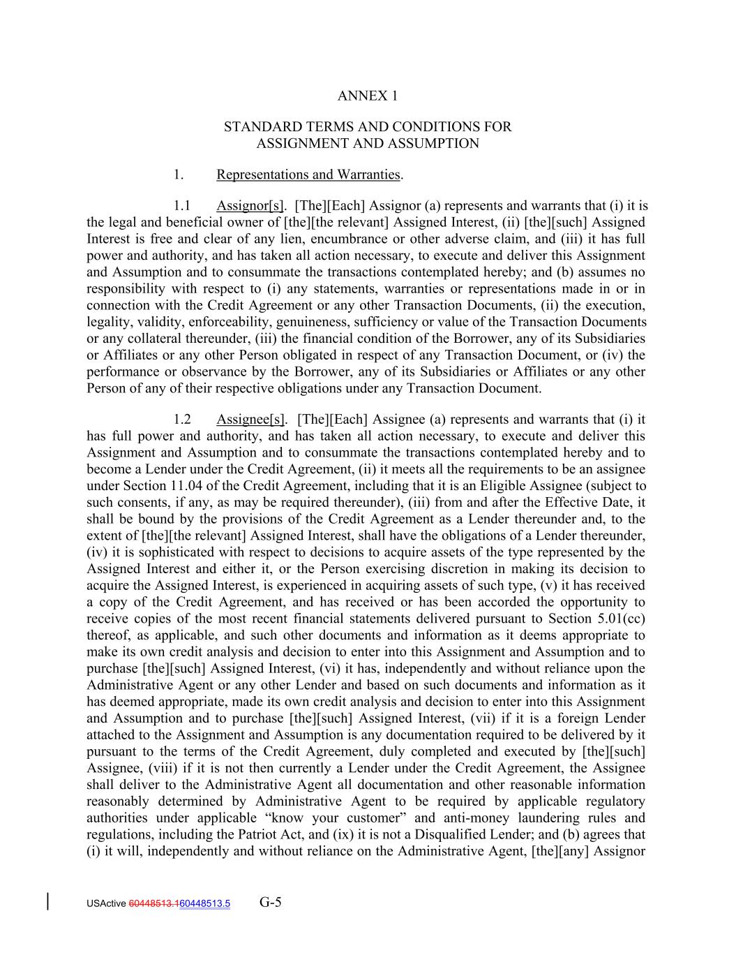 ANNEX 1 STANDARD TERMS AND CONDITIONS FOR ASSIGNMENT AND ASSUMPTION 1. Representations and Warranties. 1.1 Assignor[s]. [The][Each] Assignor (a) represents and warrants that (i) it is the legal and beneficial owner of [the][the relevant] Assigned Interest, (ii) [the][such] Assigned Interest is free and clear of any lien, encumbrance or other adverse claim, and (iii) it has full power and authority, and has taken all action necessary, to execute and deliver this Assignment and Assumption and to consummate the transactions contemplated hereby; and (b) assumes no responsibility with respect to (i) any statements, warranties or representations made in or in connection with the Credit Agreement or any other Transaction Documents, (ii) the execution, legality, validity, enforceability, genuineness, sufficiency or value of the Transaction Documents or any collateral thereunder, (iii) the financial condition of the Borrower, any of its Subsidiaries or Affiliates or any other Person obligated in respect of any Transaction Document, or (iv) the performance or observance by the Borrower, any of its Subsidiaries or Affiliates or any other Person of any of their respective obligations under any Transaction Document. 1.2 Assignee[s]. [The][Each] Assignee (a) represents and warrants that (i) it has full power and authority, and has taken all action necessary, to execute and deliver this Assignment and Assumption and to consummate the transactions contemplated hereby and to become a Lender under the Credit Agreement, (ii) it meets all the requirements to be an assignee under Section 11.04 of the Credit Agreement, including that it is an Eligible Assignee (subject to such consents, if any, as may be required thereunder), (iii) from and after the Effective Date, it shall be bound by the provisions of the Credit Agreement as a Lender thereunder and, to the extent of [the][the relevant] Assigned Interest, shall have the obligations of a Lender thereunder, (iv) it is sophisticated with respect to decisions to acquire assets of the type represented by the Assigned Interest and either it, or the Person exercising discretion in making its decision to acquire the Assigned Interest, is experienced in acquiring assets of such type, (v) it has received a copy of the Credit Agreement, and has received or has been accorded the opportunity to receive copies of the most recent financial statements delivered pursuant to Section 5.01(cc) thereof, as applicable, and such other documents and information as it deems appropriate to make its own credit analysis and decision to enter into this Assignment and Assumption and to purchase [the][such] Assigned Interest, (vi) it has, independently and without reliance upon the Administrative Agent or any other Lender and based on such documents and information as it has deemed appropriate, made its own credit analysis and decision to enter into this Assignment and Assumption and to purchase [the][such] Assigned Interest, (vii) if it is a foreign Lender attached to the Assignment and Assumption is any documentation required to be delivered by it pursuant to the terms of the Credit Agreement, duly completed and executed by [the][such] Assignee, (viii) if it is not then currently a Lender under the Credit Agreement, the Assignee shall deliver to the Administrative Agent all documentation and other reasonable information reasonably determined by Administrative Agent to be required by applicable regulatory authorities under applicable “know your customer” and anti-money laundering rules and regulations, including the Patriot Act, and (ix) it is not a Disqualified Lender; and (b) agrees that (i) it will, independently and without reliance on the Administrative Agent, [the][any] Assignor USActive 60448513.160448513.5 G-5