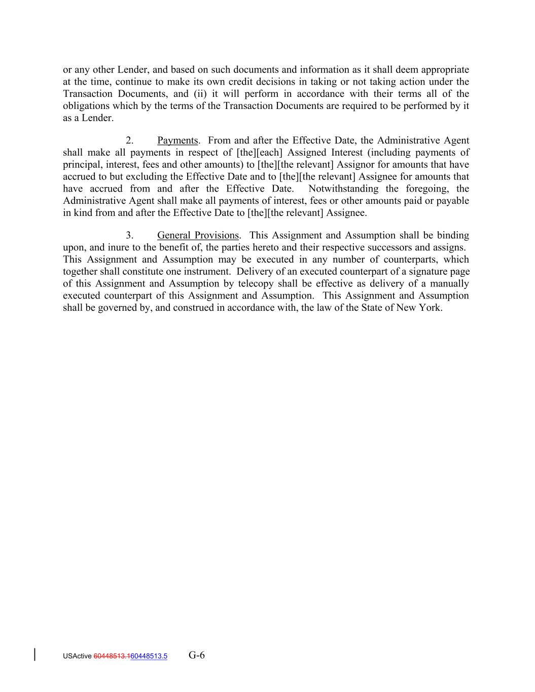 or any other Lender, and based on such documents and information as it shall deem appropriate at the time, continue to make its own credit decisions in taking or not taking action under the Transaction Documents, and (ii) it will perform in accordance with their terms all of the obligations which by the terms of the Transaction Documents are required to be performed by it as a Lender. 2. Payments. From and after the Effective Date, the Administrative Agent shall make all payments in respect of [the][each] Assigned Interest (including payments of principal, interest, fees and other amounts) to [the][the relevant] Assignor for amounts that have accrued to but excluding the Effective Date and to [the][the relevant] Assignee for amounts that have accrued from and after the Effective Date. Notwithstanding the foregoing, the Administrative Agent shall make all payments of interest, fees or other amounts paid or payable in kind from and after the Effective Date to [the][the relevant] Assignee. 3. General Provisions. This Assignment and Assumption shall be binding upon, and inure to the benefit of, the parties hereto and their respective successors and assigns. This Assignment and Assumption may be executed in any number of counterparts, which together shall constitute one instrument. Delivery of an executed counterpart of a signature page of this Assignment and Assumption by telecopy shall be effective as delivery of a manually executed counterpart of this Assignment and Assumption. This Assignment and Assumption shall be governed by, and construed in accordance with, the law of the State of New York. USActive 60448513.160448513.5 G-6