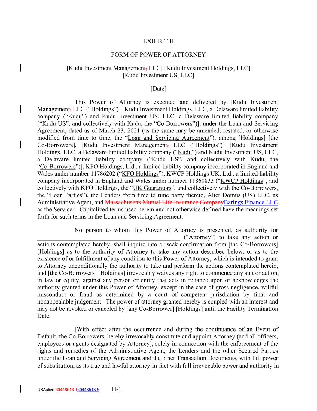 EXHIBIT H FORM OF POWER OF ATTORNEY [Kudu Investment Management, LLC] [Kudu Investment Holdings, LLC] [Kudu Investment US, LLC] [Date] This Power of Attorney is executed and delivered by [Kudu Investment Management, LLC (“Holdings”)] [Kudu Investment Holdings, LLC, a Delaware limited liability company (“Kudu”) and Kudu Investment US, LLC, a Delaware limited liability company (“Kudu US”, and collectively with Kudu, the “Co-Borrowers”)], under the Loan and Servicing Agreement, dated as of March 23, 2021 (as the same may be amended, restated, or otherwise modified from time to time, the “Loan and Servicing Agreement”), among [Holdings] [the Co-Borrowers], [Kudu Investment Management, LLC (“Holdings”)] [Kudu Investment Holdings, LLC, a Delaware limited liability company (“Kudu”) and Kudu Investment US, LLC, a Delaware limited liability company (“Kudu US”, and collectively with Kudu, the “Co-Borrowers”)], KFO Holdings, Ltd., a limited liability company incorporated in England and Wales under number 11786202 (“KFO Holdings”), KWCP Holdings UK, Ltd., a limited liability company incorporated in England and Wales under number 11860833 (“KWCP Holdings”, and collectively with KFO Holdings, the “UK Guarantors”, and collectively with the Co-Borrowers, the “Loan Parties”), the Lenders from time to time party thereto, Alter Domus (US) LLC, as Administrative Agent, and Massachusetts Mutual Life Insurance CompanyBarings Finance LLC, as the Servicer. Capitalized terms used herein and not otherwise defined have the meanings set forth for such terms in the Loan and Servicing Agreement. No person to whom this Power of Attorney is presented, as authority for ______________________________________________ (“Attorney”) to take any action or actions contemplated hereby, shall inquire into or seek confirmation from [the Co-Borrowers] [Holdings] as to the authority of Attorney to take any action described below, or as to the existence of or fulfillment of any condition to this Power of Attorney, which is intended to grant to Attorney unconditionally the authority to take and perform the actions contemplated herein, and [the Co-Borrowers] [Holdings] irrevocably waives any right to commence any suit or action, in law or equity, against any person or entity that acts in reliance upon or acknowledges the authority granted under this Power of Attorney, except in the case of gross negligence, willful misconduct or fraud as determined by a court of competent jurisdiction by final and nonappealable judgement. The power of attorney granted hereby is coupled with an interest and may not be revoked or canceled by [any Co-Borrower] [Holdings] until the Facility Termination Date. [With effect after the occurrence and during the continuance of an Event of Default, the Co-Borrowers, hereby irrevocably constitute and appoint Attorney (and all officers, employees or agents designated by Attorney), solely in connection with the enforcement of the rights and remedies of the Administrative Agent, the Lenders and the other Secured Parties under the Loan and Servicing Agreement and the other Transaction Documents, with full power of substitution, as its true and lawful attorney-in‐fact with full irrevocable power and authority in USActive 60448513.160448513.5 H-1