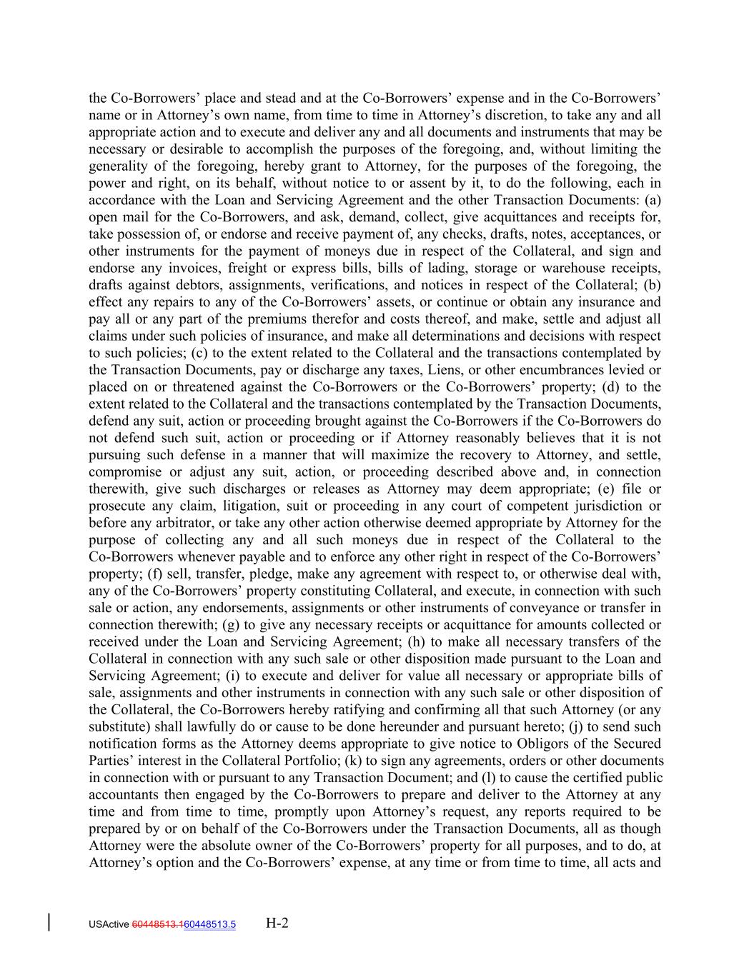 the Co-Borrowers’ place and stead and at the Co-Borrowers’ expense and in the Co-Borrowers’ name or in Attorney’s own name, from time to time in Attorney’s discretion, to take any and all appropriate action and to execute and deliver any and all documents and instruments that may be necessary or desirable to accomplish the purposes of the foregoing, and, without limiting the generality of the foregoing, hereby grant to Attorney, for the purposes of the foregoing, the power and right, on its behalf, without notice to or assent by it, to do the following, each in accordance with the Loan and Servicing Agreement and the other Transaction Documents: (a) open mail for the Co-Borrowers, and ask, demand, collect, give acquittances and receipts for, take possession of, or endorse and receive payment of, any checks, drafts, notes, acceptances, or other instruments for the payment of moneys due in respect of the Collateral, and sign and endorse any invoices, freight or express bills, bills of lading, storage or warehouse receipts, drafts against debtors, assignments, verifications, and notices in respect of the Collateral; (b) effect any repairs to any of the Co-Borrowers’ assets, or continue or obtain any insurance and pay all or any part of the premiums therefor and costs thereof, and make, settle and adjust all claims under such policies of insurance, and make all determinations and decisions with respect to such policies; (c) to the extent related to the Collateral and the transactions contemplated by the Transaction Documents, pay or discharge any taxes, Liens, or other encumbrances levied or placed on or threatened against the Co-Borrowers or the Co-Borrowers’ property; (d) to the extent related to the Collateral and the transactions contemplated by the Transaction Documents, defend any suit, action or proceeding brought against the Co-Borrowers if the Co-Borrowers do not defend such suit, action or proceeding or if Attorney reasonably believes that it is not pursuing such defense in a manner that will maximize the recovery to Attorney, and settle, compromise or adjust any suit, action, or proceeding described above and, in connection therewith, give such discharges or releases as Attorney may deem appropriate; (e) file or prosecute any claim, litigation, suit or proceeding in any court of competent jurisdiction or before any arbitrator, or take any other action otherwise deemed appropriate by Attorney for the purpose of collecting any and all such moneys due in respect of the Collateral to the Co-Borrowers whenever payable and to enforce any other right in respect of the Co-Borrowers’ property; (f) sell, transfer, pledge, make any agreement with respect to, or otherwise deal with, any of the Co-Borrowers’ property constituting Collateral, and execute, in connection with such sale or action, any endorsements, assignments or other instruments of conveyance or transfer in connection therewith; (g) to give any necessary receipts or acquittance for amounts collected or received under the Loan and Servicing Agreement; (h) to make all necessary transfers of the Collateral in connection with any such sale or other disposition made pursuant to the Loan and Servicing Agreement; (i) to execute and deliver for value all necessary or appropriate bills of sale, assignments and other instruments in connection with any such sale or other disposition of the Collateral, the Co-Borrowers hereby ratifying and confirming all that such Attorney (or any substitute) shall lawfully do or cause to be done hereunder and pursuant hereto; (j) to send such notification forms as the Attorney deems appropriate to give notice to Obligors of the Secured Parties’ interest in the Collateral Portfolio; (k) to sign any agreements, orders or other documents in connection with or pursuant to any Transaction Document; and (l) to cause the certified public accountants then engaged by the Co-Borrowers to prepare and deliver to the Attorney at any time and from time to time, promptly upon Attorney’s request, any reports required to be prepared by or on behalf of the Co-Borrowers under the Transaction Documents, all as though Attorney were the absolute owner of the Co-Borrowers’ property for all purposes, and to do, at Attorney’s option and the Co-Borrowers’ expense, at any time or from time to time, all acts and USActive 60448513.160448513.5 H-2