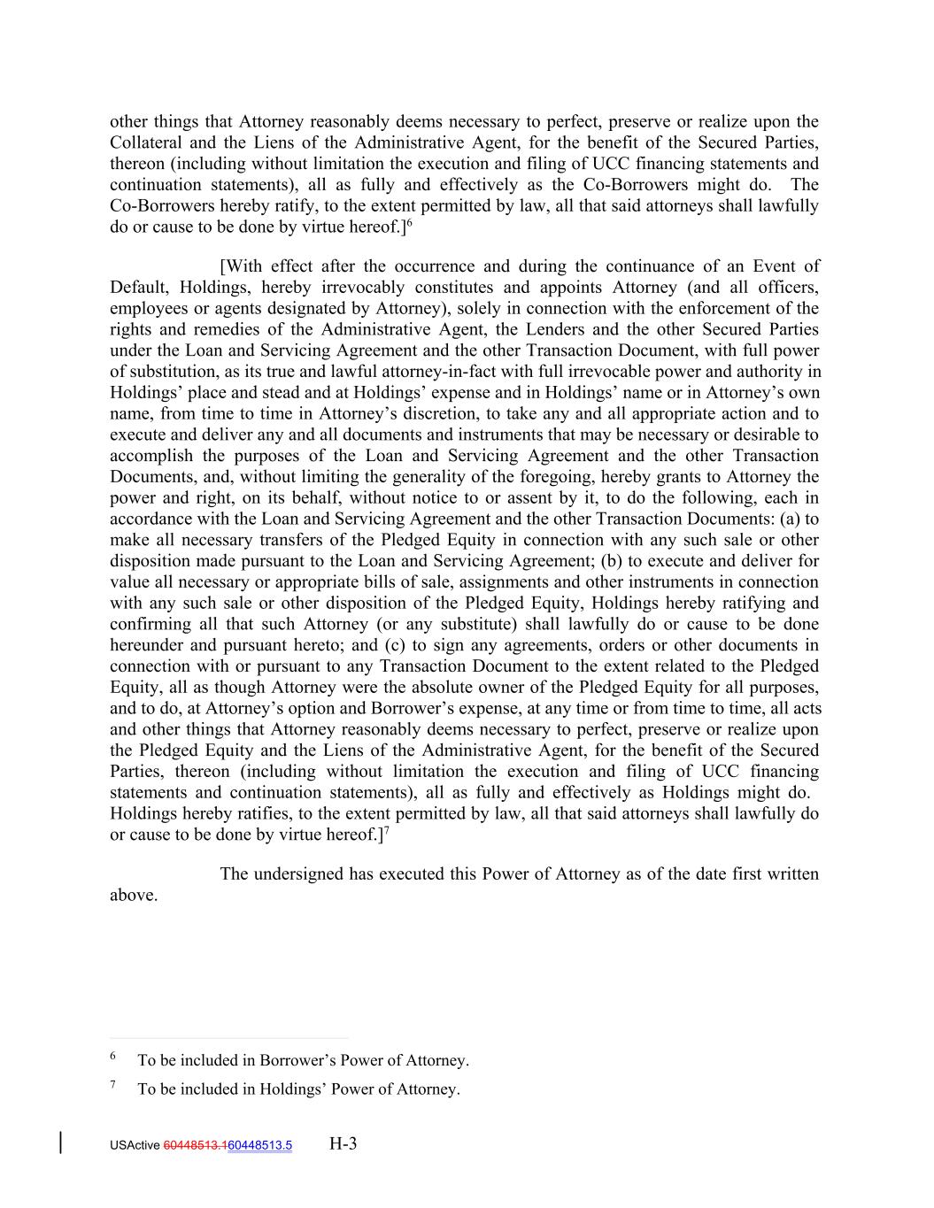 USActive 60448513.160448513.5 H-3 [With effect after the occurrence and during the continuance of an Event of Default, Holdings, hereby irrevocably constitutes and appoints Attorney (and all officers, employees or agents designated by Attorney), solely in connection with the enforcement of the rights and remedies of the Administrative Agent, the Lenders and the other Secured Parties under the Loan and Servicing Agreement and the other Transaction Document, with full power of substitution, as its true and lawful attorney-in-fact with full irrevocable power and authority in Holdings’ place and stead and at Holdings’ expense and in Holdings’ name or in Attorney’s own name, from time to time in Attorney’s discretion, to take any and all appropriate action and to execute and deliver any and all documents and instruments that may be necessary or desirable to accomplish the purposes of the Loan and Servicing Agreement and the other Transaction Documents, and, without limiting the generality of the foregoing, hereby grants to Attorney the power and right, on its behalf, without notice to or assent by it, to do the following, each in accordance with the Loan and Servicing Agreement and the other Transaction Documents: (a) to make all necessary transfers of the Pledged Equity in connection with any such sale or other disposition made pursuant to the Loan and Servicing Agreement; (b) to execute and deliver for value all necessary or appropriate bills of sale, assignments and other instruments in connection with any such sale or other disposition of the Pledged Equity, Holdings hereby ratifying and confirming all that such Attorney (or any substitute) shall lawfully do or cause to be done hereunder and pursuant hereto; and (c) to sign any agreements, orders or other documents in connection with or pursuant to any Transaction Document to the extent related to the Pledged Equity, all as though Attorney were the absolute owner of the Pledged Equity for all purposes, and to do, at Attorney’s option and Borrower’s expense, at any time or from time to time, all acts and other things that Attorney reasonably deems necessary to perfect, preserve or realize upon the Pledged Equity and the Liens of the Administrative Agent, for the benefit of the Secured Parties, thereon (including without limitation the execution and filing of UCC financing statements and continuation statements), all as fully and effectively as Holdings might do. Holdings hereby ratifies, to the extent permitted by law, all that said attorneys shall lawfully do or cause to be done by virtue hereof.]7 The undersigned has executed this Power of Attorney as of the date first written above. other things that Attorney reasonably deems necessary to perfect, preserve or realize upon the Collateral and the Liens of the Administrative Agent, for the benefit of the Secured Parties, thereon (including without limitation the execution and filing of UCC financing statements and continuation statements), all as fully and effectively as the Co-Borrowers might do. The Co-Borrowers hereby ratify, to the extent permitted by law, all that said attorneys shall lawfully do or cause to be done by virtue hereof.]6 6 To be included in Borrower’s Power of Attorney. 7 To be included in Holdings’ Power of Attorney.