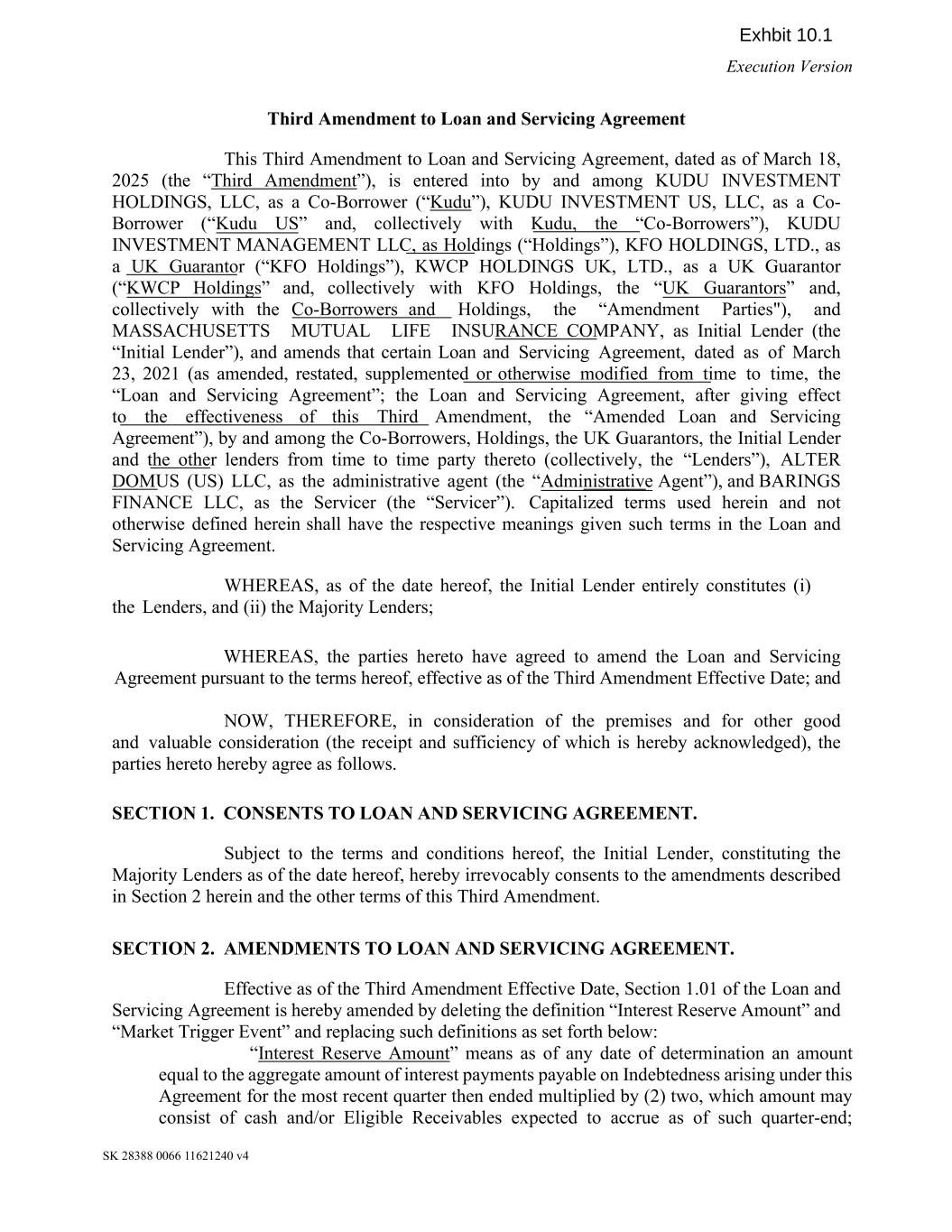 Execution Version SK 28388 0066 11621240 v4 Third Amendment to Loan and Servicing Agreement This Third Amendment to Loan and Servicing Agreement, dated as of March 18, 2025 (the “Third Amendment”), is entered into by and among KUDU INVESTMENT HOLDINGS, LLC, as a Co-Borrower (“Kudu”), KUDU INVESTMENT US, LLC, as a Co- Borrower (“Kudu US” and, collectively with Kudu, the “Co-Borrowers”), KUDU INVESTMENT MANAGEMENT LLC, as Holdings (“Holdings”), KFO HOLDINGS, LTD., as a UK Guarantor (“KFO Holdings”), KWCP HOLDINGS UK, LTD., as a UK Guarantor (“KWCP Holdings” and, collectively with KFO Holdings, the “UK Guarantors” and, collectively with the Co-Borrowers and Holdings, the “Amendment Parties"), and MASSACHUSETTS MUTUAL LIFE INSURANCE COMPANY, as Initial Lender (the “Initial Lender”), and amends that certain Loan and Servicing Agreement, dated as of March 23, 2021 (as amended, restated, supplemented or otherwise modified from time to time, the “Loan and Servicing Agreement”; the Loan and Servicing Agreement, after giving effect to the effectiveness of this Third Amendment, the “Amended Loan and Servicing Agreement”), by and among the Co-Borrowers, Holdings, the UK Guarantors, the Initial Lender and the other lenders from time to time party thereto (collectively, the “Lenders”), ALTER DOMUS (US) LLC, as the administrative agent (the “Administrative Agent”), and BARINGS FINANCE LLC, as the Servicer (the “Servicer”). Capitalized terms used herein and not otherwise defined herein shall have the respective meanings given such terms in the Loan and Servicing Agreement. WHEREAS, as of the date hereof, the Initial Lender entirely constitutes (i) the Lenders, and (ii) the Majority Lenders; WHEREAS, the parties hereto have agreed to amend the Loan and Servicing Agreement pursuant to the terms hereof, effective as of the Third Amendment Effective Date; and NOW, THEREFORE, in consideration of the premises and for other good and valuable consideration (the receipt and sufficiency of which is hereby acknowledged), the parties hereto hereby agree as follows. SECTION 1. CONSENTS TO LOAN AND SERVICING AGREEMENT. Subject to the terms and conditions hereof, the Initial Lender, constituting the Majority Lenders as of the date hereof, hereby irrevocably consents to the amendments described in Section 2 herein and the other terms of this Third Amendment. SECTION 2. AMENDMENTS TO LOAN AND SERVICING AGREEMENT. Effective as of the Third Amendment Effective Date, Section 1.01 of the Loan and Servicing Agreement is hereby amended by deleting the definition “Interest Reserve Amount” and “Market Trigger Event” and replacing such definitions as set forth below: “Interest Reserve Amount” means as of any date of determination an amount equal to the aggregate amount of interest payments payable on Indebtedness arising under this Agreement for the most recent quarter then ended multiplied by (2) two, which amount may consist of cash and/or Eligible Receivables expected to accrue as of such quarter‐end;
