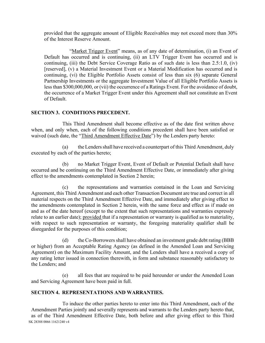 SK 28388 0066 11621240 v4 provided that the aggregate amount of Eligible Receivables may not exceed more than 30% of the Interest Reserve Amount. “Market Trigger Event” means, as of any date of determination, (i) an Event of Default has occurred and is continuing, (ii) an LTV Trigger Event has occurred and is continuing, (iii) the Debt Service Coverage Ratio as of such date is less than 2.5:1.0, (iv) [reserved], (v) a Material Investment Event or a Material Modification has occurred and is continuing, (vi) the Eligible Portfolio Assets consist of less than six (6) separate General Partnership Investments or the aggregate Investment Value of all Eligible Portfolio Assets is less than $300,000,000, or (vii) the occurrence of a Ratings Event. For the avoidance of doubt, the occurrence of a Market Trigger Event under this Agreement shall not constitute an Event of Default. SECTION 3. CONDITIONS PRECEDENT. This Third Amendment shall become effective as of the date first written above when, and only when, each of the following conditions precedent shall have been satisfied or waived (such date, the “Third Amendment Effective Date”) by the Lenders party hereto: (a) the Lenders shall have received a counterpart of this Third Amendment, duly executed by each of the parties hereto; (b) no Market Trigger Event, Event of Default or Potential Default shall have occurred and be continuing on the Third Amendment Effective Date, or immediately after giving effect to the amendments contemplated in Section 2 herein; (c) the representations and warranties contained in the Loan and Servicing Agreement, this Third Amendment and each other Transaction Document are true and correct in all material respects on the Third Amendment Effective Date, and immediately after giving effect to the amendments contemplated in Section 2 herein, with the same force and effect as if made on and as of the date hereof (except to the extent that such representations and warranties expressly relate to an earlier date); provided that if a representation or warranty is qualified as to materiality, with respect to such representation or warranty, the foregoing materiality qualifier shall be disregarded for the purposes of this condition; (d) the Co-Borrowers shall have obtained an investment grade debt rating (BBB or higher) from an Acceptable Rating Agency (as defined in the Amended Loan and Servicing Agreement) on the Maximum Facility Amount, and the Lenders shall have a received a copy of any rating letter issued in connection therewith, in form and substance reasonably satisfactory to the Lenders; and (e) all fees that are required to be paid hereunder or under the Amended Loan and Servicing Agreement have been paid in full. SECTION 4. REPRESENTATIONS AND WARRANTIES. To induce the other parties hereto to enter into this Third Amendment, each of the Amendment Parties jointly and severally represents and warrants to the Lenders party hereto that, as of the Third Amendment Effective Date, both before and after giving effect to this Third