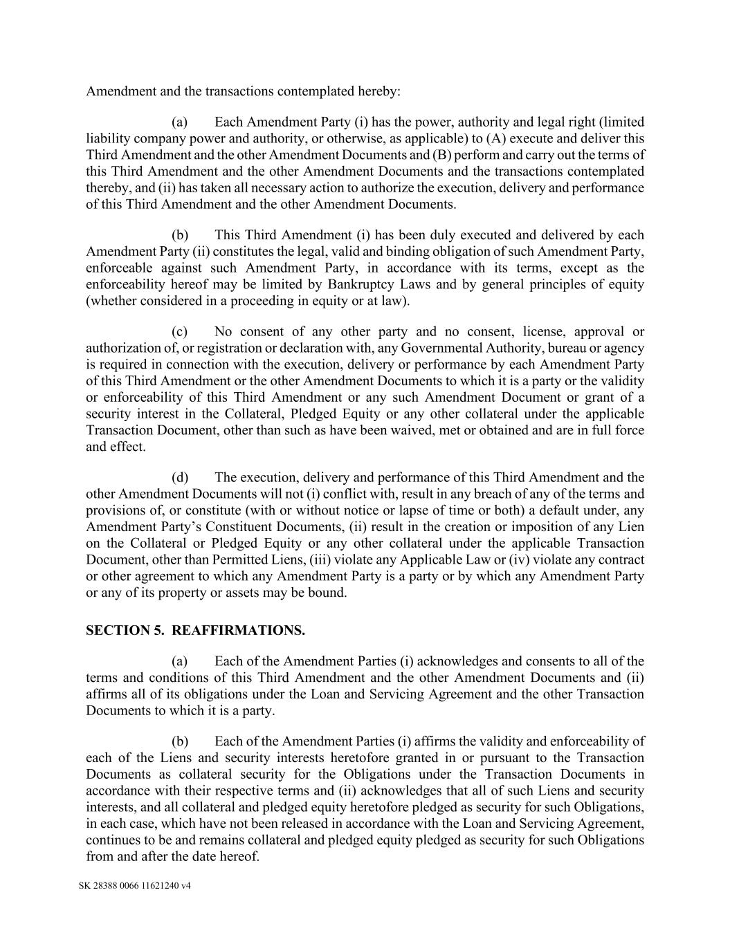SK 28388 0066 11621240 v4 Amendment and the transactions contemplated hereby: (a) Each Amendment Party (i) has the power, authority and legal right (limited liability company power and authority, or otherwise, as applicable) to (A) execute and deliver this Third Amendment and the other Amendment Documents and (B) perform and carry out the terms of this Third Amendment and the other Amendment Documents and the transactions contemplated thereby, and (ii) has taken all necessary action to authorize the execution, delivery and performance of this Third Amendment and the other Amendment Documents. (b) This Third Amendment (i) has been duly executed and delivered by each Amendment Party (ii) constitutes the legal, valid and binding obligation of such Amendment Party, enforceable against such Amendment Party, in accordance with its terms, except as the enforceability hereof may be limited by Bankruptcy Laws and by general principles of equity (whether considered in a proceeding in equity or at law). (c) No consent of any other party and no consent, license, approval or authorization of, or registration or declaration with, any Governmental Authority, bureau or agency is required in connection with the execution, delivery or performance by each Amendment Party of this Third Amendment or the other Amendment Documents to which it is a party or the validity or enforceability of this Third Amendment or any such Amendment Document or grant of a security interest in the Collateral, Pledged Equity or any other collateral under the applicable Transaction Document, other than such as have been waived, met or obtained and are in full force and effect. (d) The execution, delivery and performance of this Third Amendment and the other Amendment Documents will not (i) conflict with, result in any breach of any of the terms and provisions of, or constitute (with or without notice or lapse of time or both) a default under, any Amendment Party’s Constituent Documents, (ii) result in the creation or imposition of any Lien on the Collateral or Pledged Equity or any other collateral under the applicable Transaction Document, other than Permitted Liens, (iii) violate any Applicable Law or (iv) violate any contract or other agreement to which any Amendment Party is a party or by which any Amendment Party or any of its property or assets may be bound. SECTION 5. REAFFIRMATIONS. (a) Each of the Amendment Parties (i) acknowledges and consents to all of the terms and conditions of this Third Amendment and the other Amendment Documents and (ii) affirms all of its obligations under the Loan and Servicing Agreement and the other Transaction Documents to which it is a party. (b) Each of the Amendment Parties (i) affirms the validity and enforceability of each of the Liens and security interests heretofore granted in or pursuant to the Transaction Documents as collateral security for the Obligations under the Transaction Documents in accordance with their respective terms and (ii) acknowledges that all of such Liens and security interests, and all collateral and pledged equity heretofore pledged as security for such Obligations, in each case, which have not been released in accordance with the Loan and Servicing Agreement, continues to be and remains collateral and pledged equity pledged as security for such Obligations from and after the date hereof.
