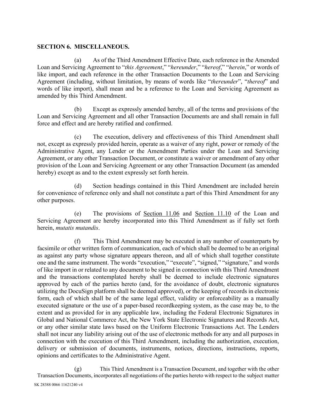 SK 28388 0066 11621240 v4 SECTION 6. MISCELLANEOUS. (a) As of the Third Amendment Effective Date, each reference in the Amended Loan and Servicing Agreement to “this Agreement,” “hereunder,” “hereof,” “herein,” or words of like import, and each reference in the other Transaction Documents to the Loan and Servicing Agreement (including, without limitation, by means of words like “thereunder”, “thereof” and words of like import), shall mean and be a reference to the Loan and Servicing Agreement as amended by this Third Amendment. (b) Except as expressly amended hereby, all of the terms and provisions of the Loan and Servicing Agreement and all other Transaction Documents are and shall remain in full force and effect and are hereby ratified and confirmed. (c) The execution, delivery and effectiveness of this Third Amendment shall not, except as expressly provided herein, operate as a waiver of any right, power or remedy of the Administrative Agent, any Lender or the Amendment Parties under the Loan and Servicing Agreement, or any other Transaction Document, or constitute a waiver or amendment of any other provision of the Loan and Servicing Agreement or any other Transaction Document (as amended hereby) except as and to the extent expressly set forth herein. (d) Section headings contained in this Third Amendment are included herein for convenience of reference only and shall not constitute a part of this Third Amendment for any other purposes. (e) The provisions of Section 11.06 and Section 11.10 of the Loan and Servicing Agreement are hereby incorporated into this Third Amendment as if fully set forth herein, mutatis mutandis. (f) This Third Amendment may be executed in any number of counterparts by facsimile or other written form of communication, each of which shall be deemed to be an original as against any party whose signature appears thereon, and all of which shall together constitute one and the same instrument. The words “execution,” “execute”, “signed,” “signature,” and words of like import in or related to any document to be signed in connection with this Third Amendment and the transactions contemplated hereby shall be deemed to include electronic signatures approved by each of the parties hereto (and, for the avoidance of doubt, electronic signatures utilizing the DocuSign platform shall be deemed approved), or the keeping of records in electronic form, each of which shall be of the same legal effect, validity or enforceability as a manually executed signature or the use of a paper-based recordkeeping system, as the case may be, to the extent and as provided for in any applicable law, including the Federal Electronic Signatures in Global and National Commerce Act, the New York State Electronic Signatures and Records Act, or any other similar state laws based on the Uniform Electronic Transactions Act. The Lenders shall not incur any liability arising out of the use of electronic methods for any and all purposes in connection with the execution of this Third Amendment, including the authorization, execution, delivery or submission of documents, instruments, notices, directions, instructions, reports, opinions and certificates to the Administrative Agent. (g) This Third Amendment is a Transaction Document, and together with the other Transaction Documents, incorporates all negotiations of the parties hereto with respect to the subject matter