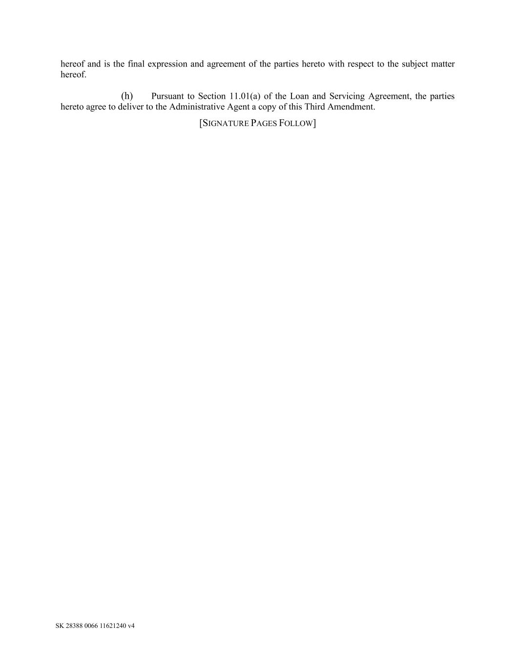 SK 28388 0066 11621240 v4 hereof and is the final expression and agreement of the parties hereto with respect to the subject matter hereof. (h) Pursuant to Section 11.01(a) of the Loan and Servicing Agreement, the parties hereto agree to deliver to the Administrative Agent a copy of this Third Amendment. [SIGNATURE PAGES FOLLOW]